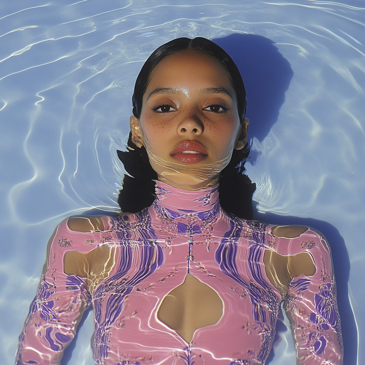 A serene portrait of a woman floating in water, wearing a pink patterned outfit with ripples reflecting light beautifully.