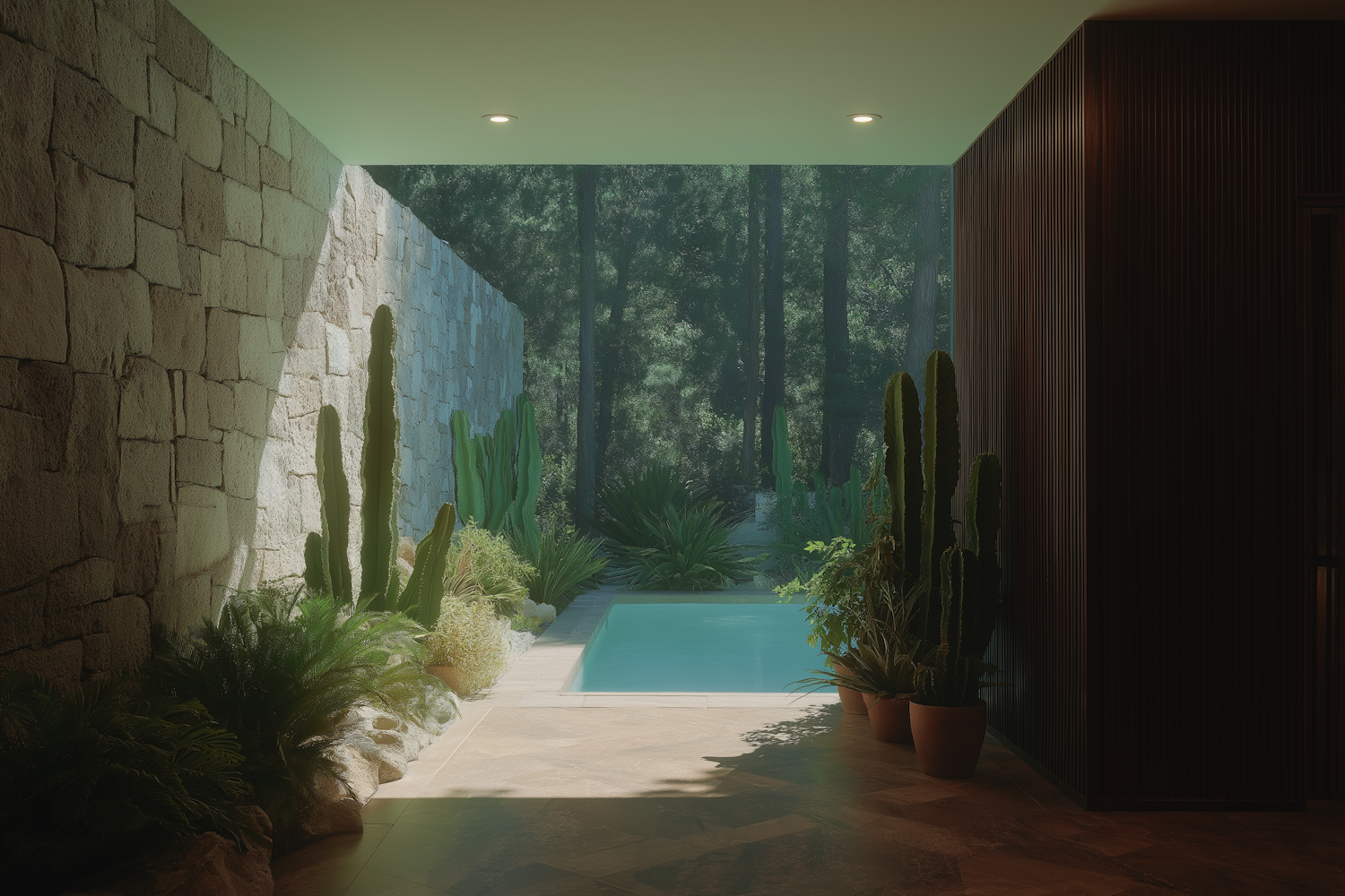 A tranquil indoor-outdoor space with a pool, lush greenery, stone and wood walls, and a view of a dense forest.