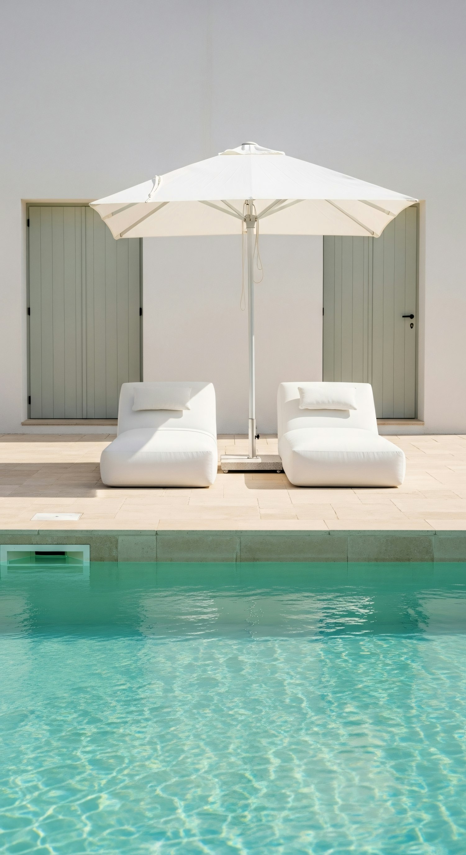 Minimalist poolside setup with white lounge chairs, a large umbrella, and clear turquoise water, perfect for a relaxing summer day.
