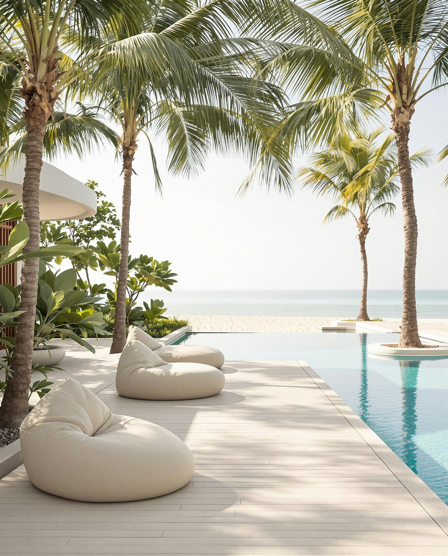 Relaxing poolside scene with bean bag chairs, palm trees, and a view of the beach and ocean. Perfect for a tropical getaway.
