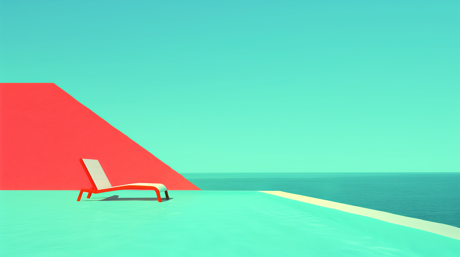Minimalist scene with a red lounge chair by a turquoise pool, set against a bold red wall and ocean view.