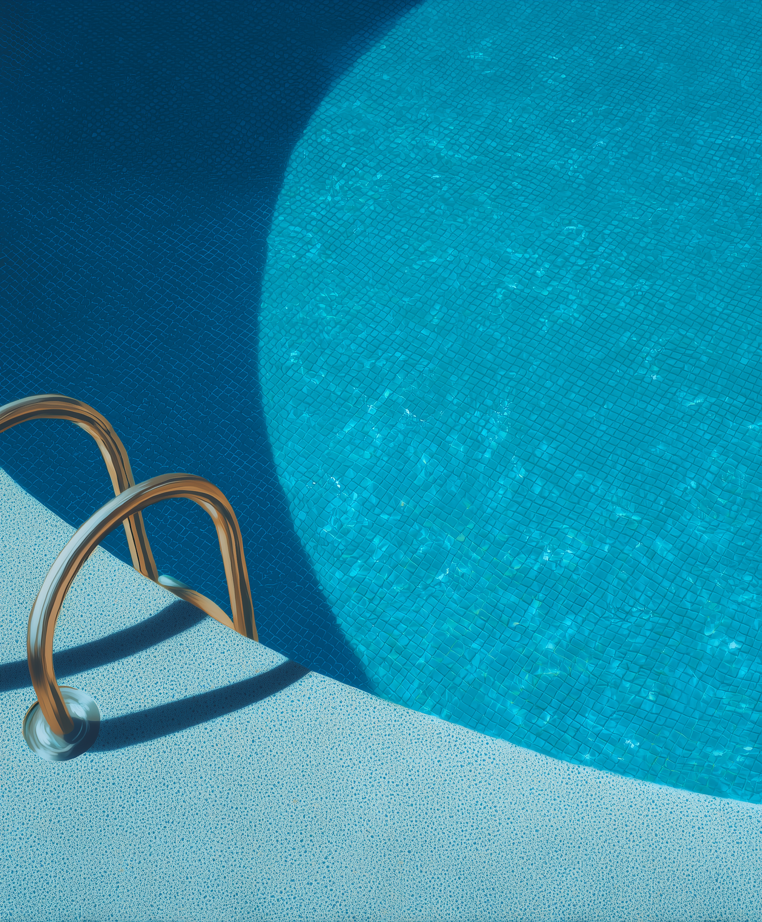 A close-up of a pool's edge with shimmering blue water and a metallic handrail casting shadows on the textured surface.
