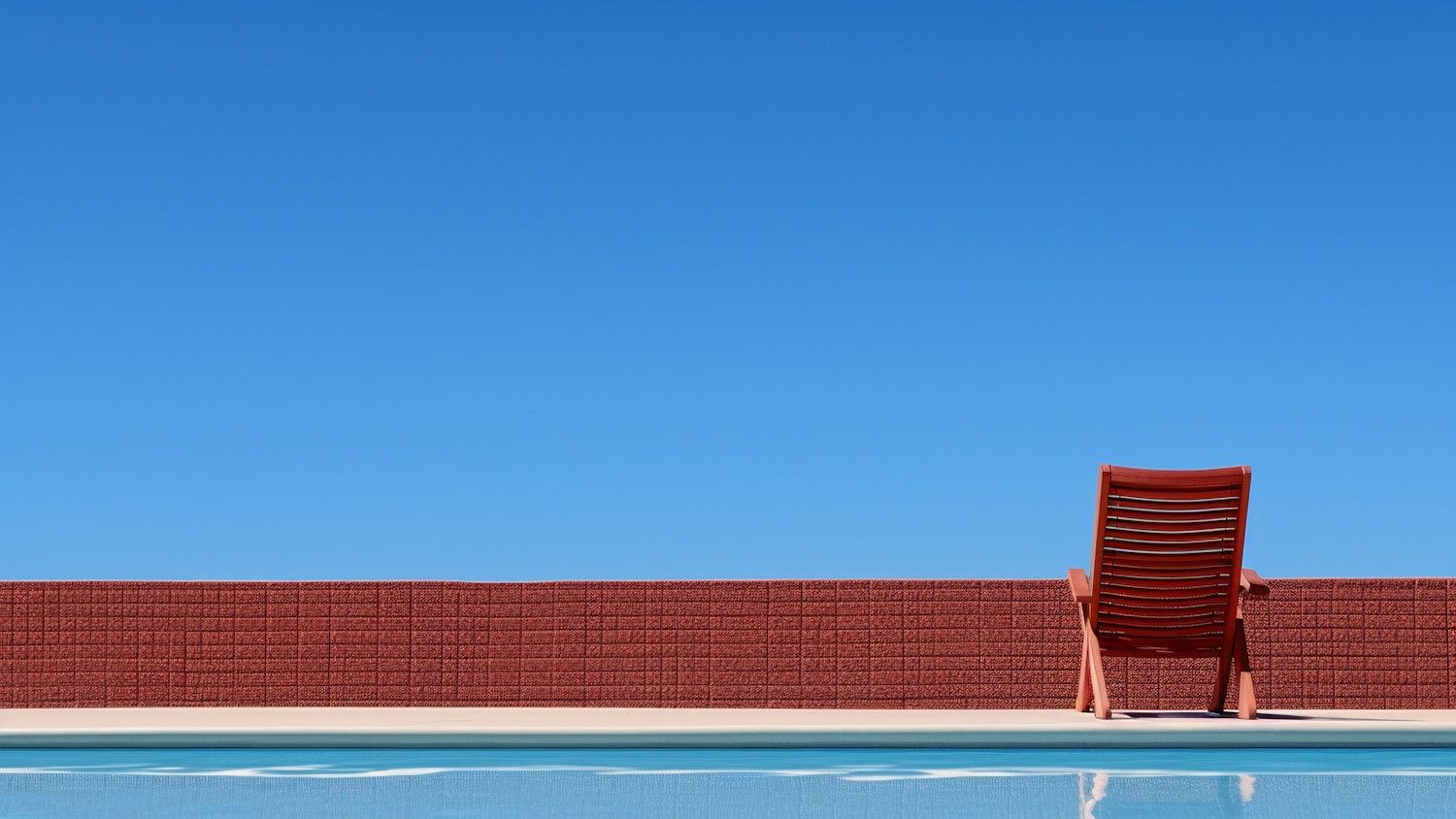 Red lounge chair by a pool with a clear blue sky and brick wall backdrop, creating a serene and minimalistic scene.