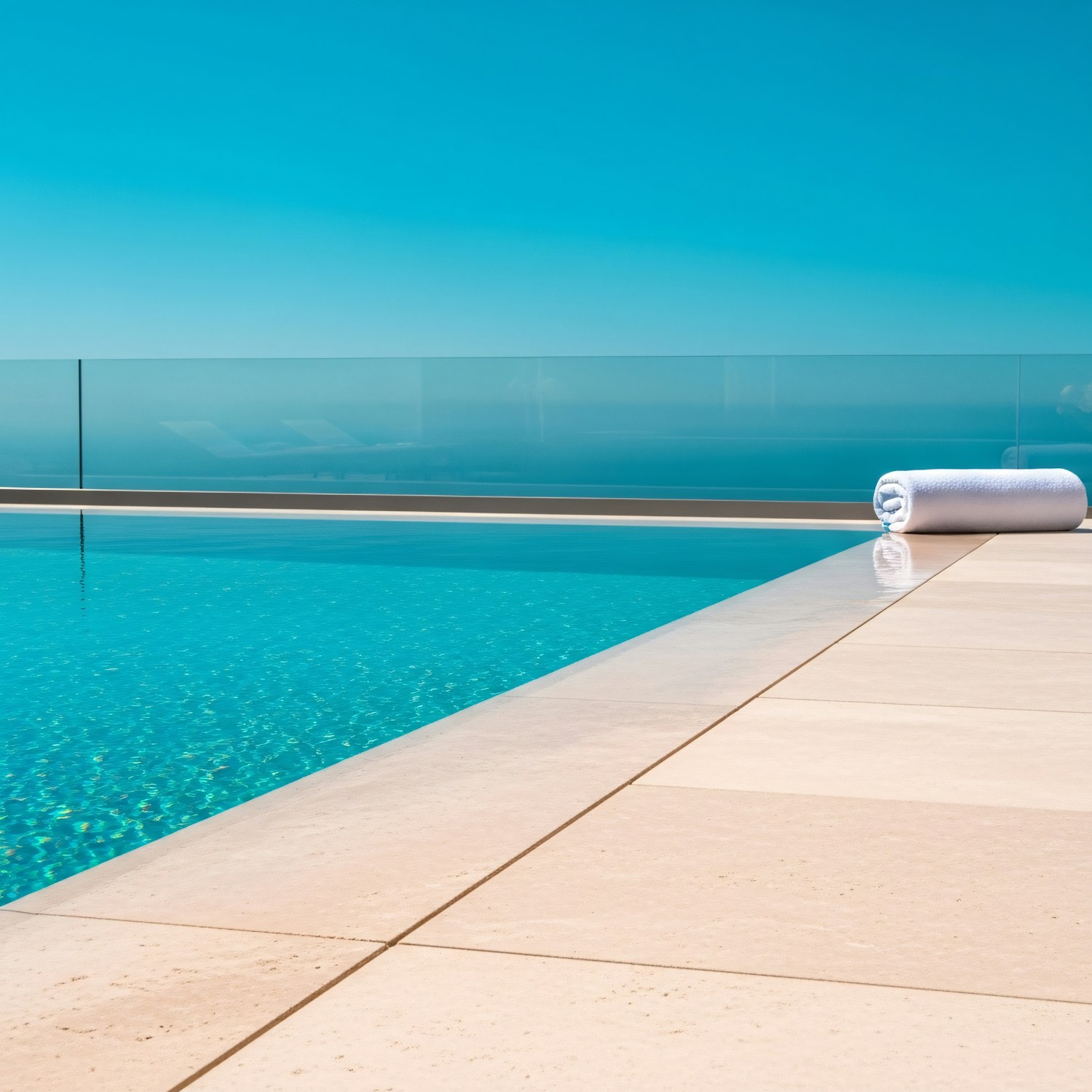Luxurious poolside view with turquoise water, beige tiles, and a rolled white towel under a clear blue sky.