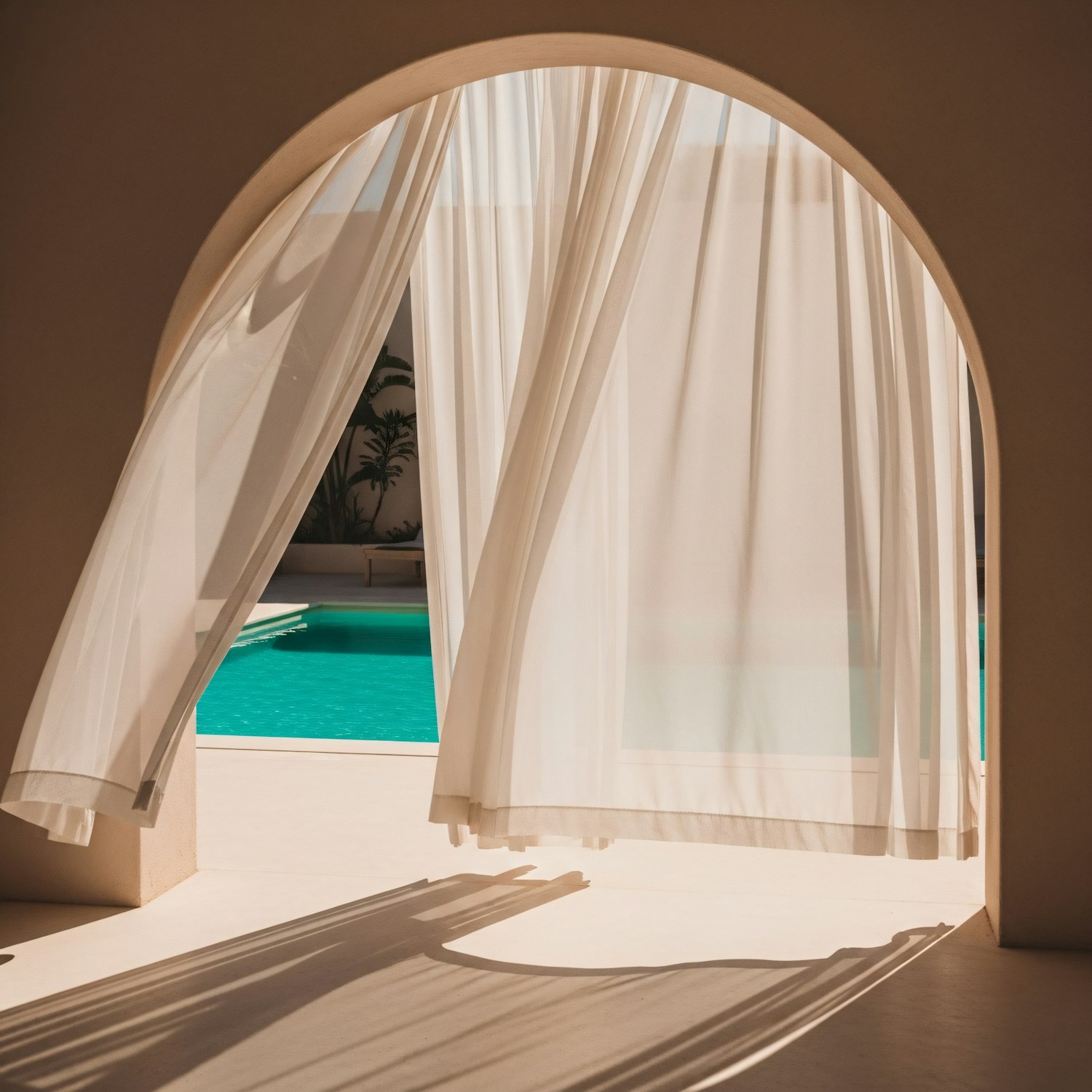A tranquil poolside view through flowing white curtains in an arched doorway, with sunlight casting soft shadows on a minimalist setting.
