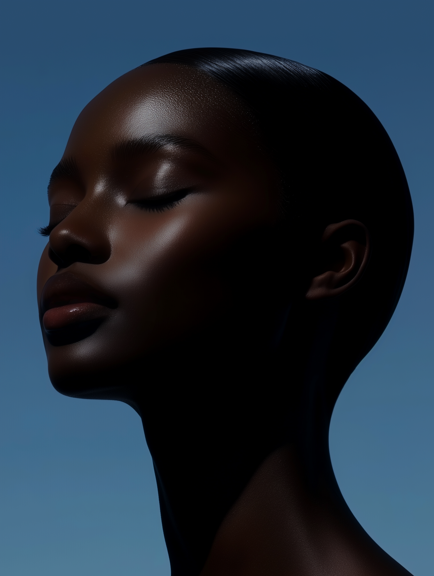 Elegant portrait of a Black woman with closed eyes, serene expression, and smooth skin against a deep blue background.