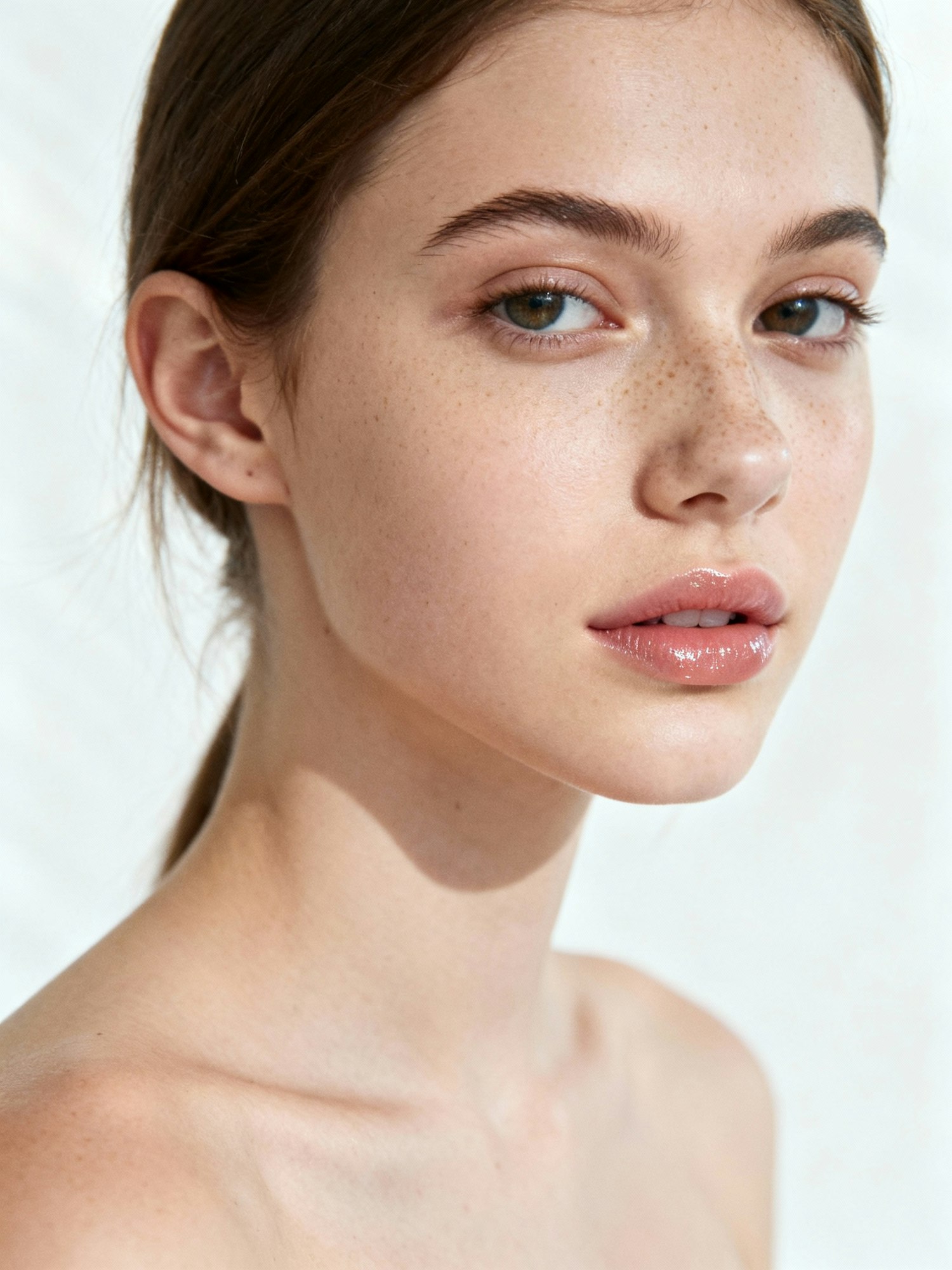 Close-up portrait of a young woman with fair skin, freckles, and natural makeup, set against a softly lit background.