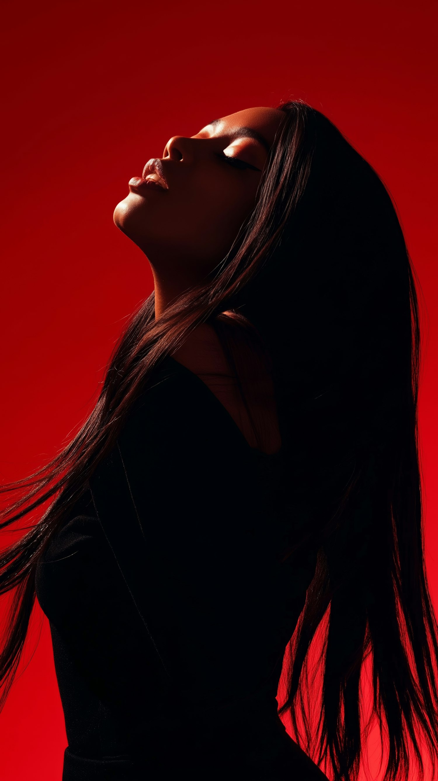 A dramatic portrait of a woman with long dark hair against a vivid red background, showcasing bold lighting and striking contrasts.