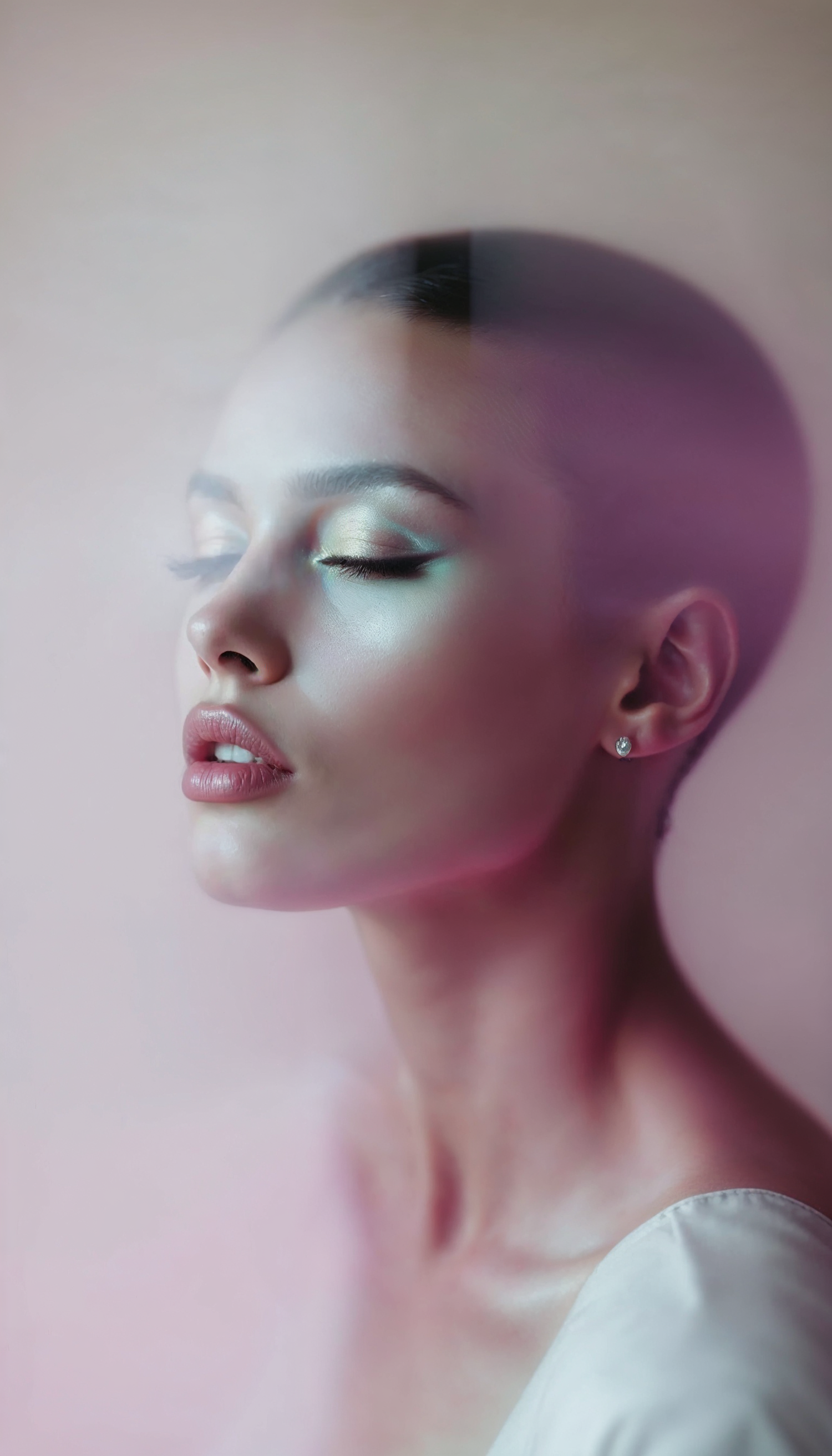 Serene portrait of a woman with iridescent makeup and soft lighting, creating a dreamy, ethereal atmosphere.