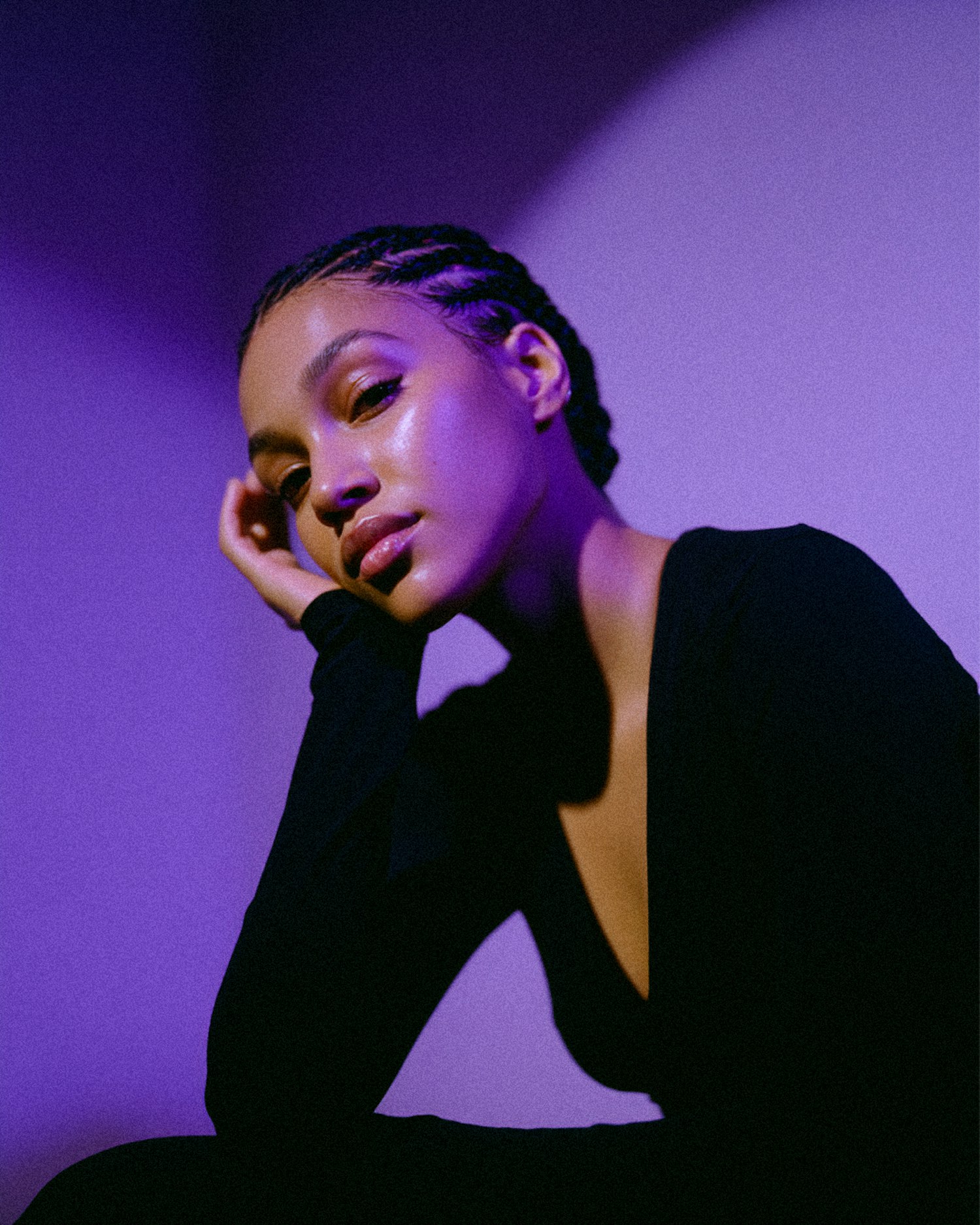 A serene portrait of a woman with cornrows, glowing skin, and a black outfit, set against a softly lit purple background.