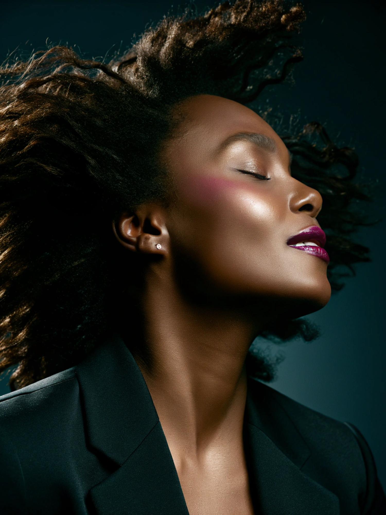 Close-up of a serene Black woman with textured hair, bold magenta lipstick, and glowing skin against a deep teal background.