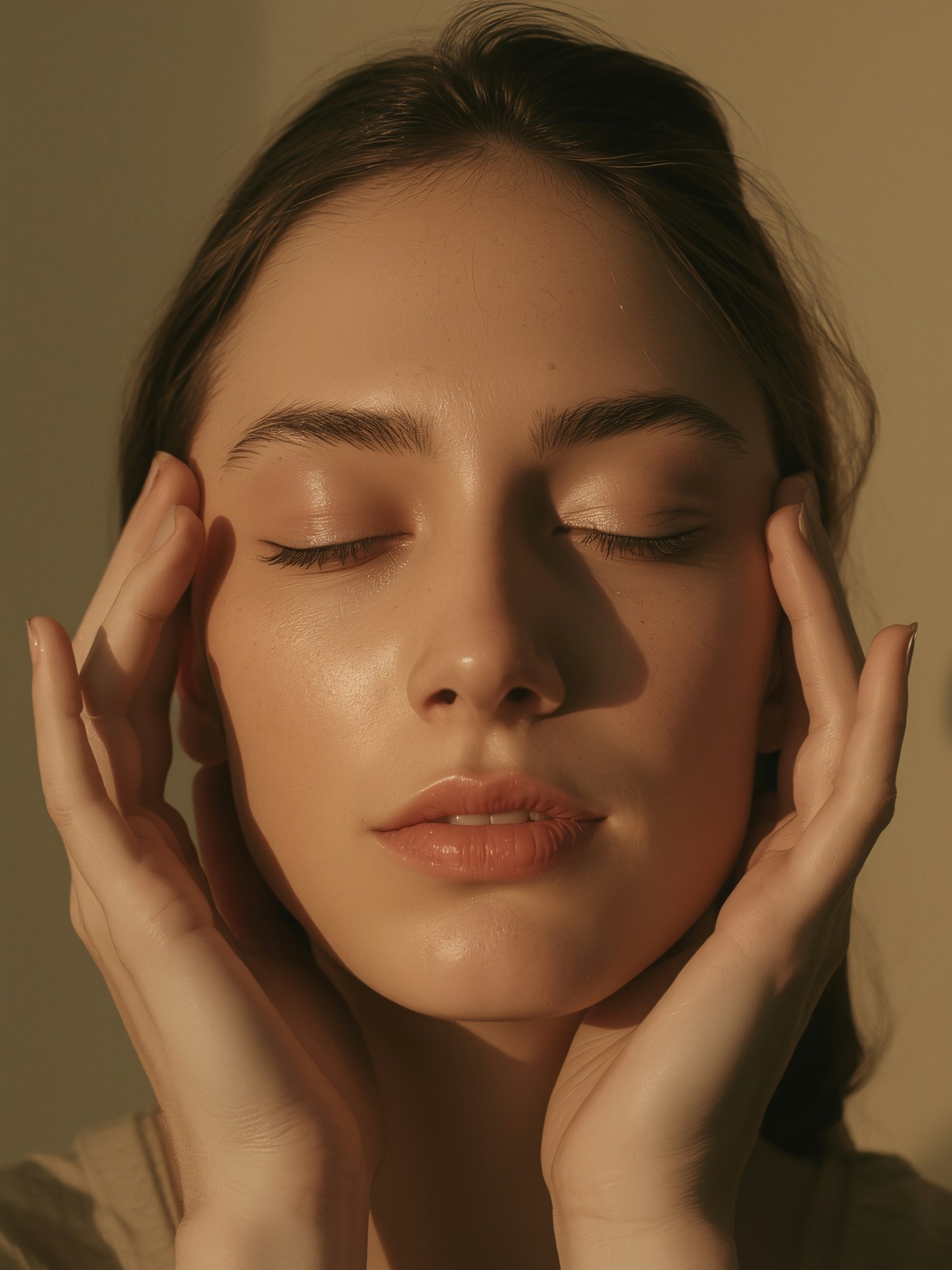 Close-up of a serene individual with closed eyes, warm lighting highlighting their features and hands gently framing their face.