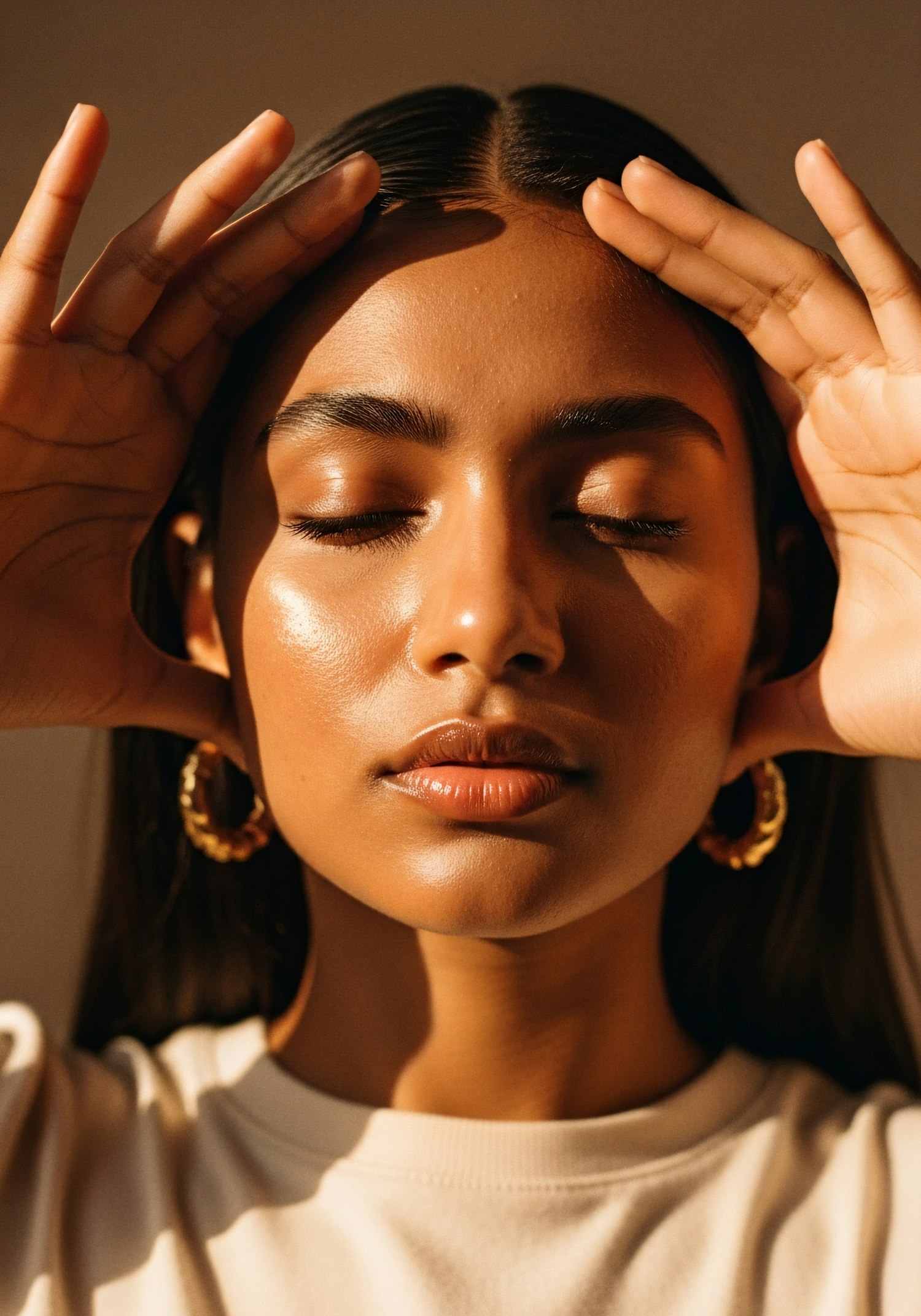 Close-up of a serene individual with glowing skin, gold hoop earrings, and warm lighting emphasizing their natural beauty.
