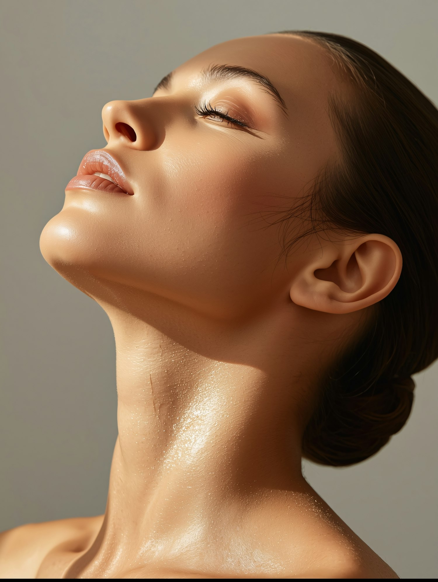 Close-up of a serene individual with glowing skin, basking in soft light, showcasing natural beauty and a peaceful expression.