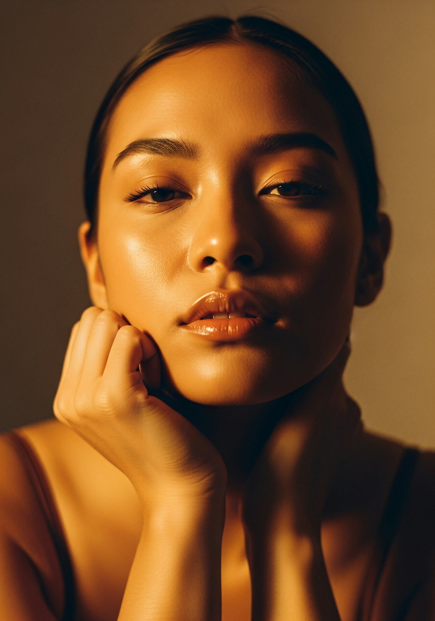 Close-up portrait of a person with glowing skin and warm lighting, showcasing serene expression and glossy lips.