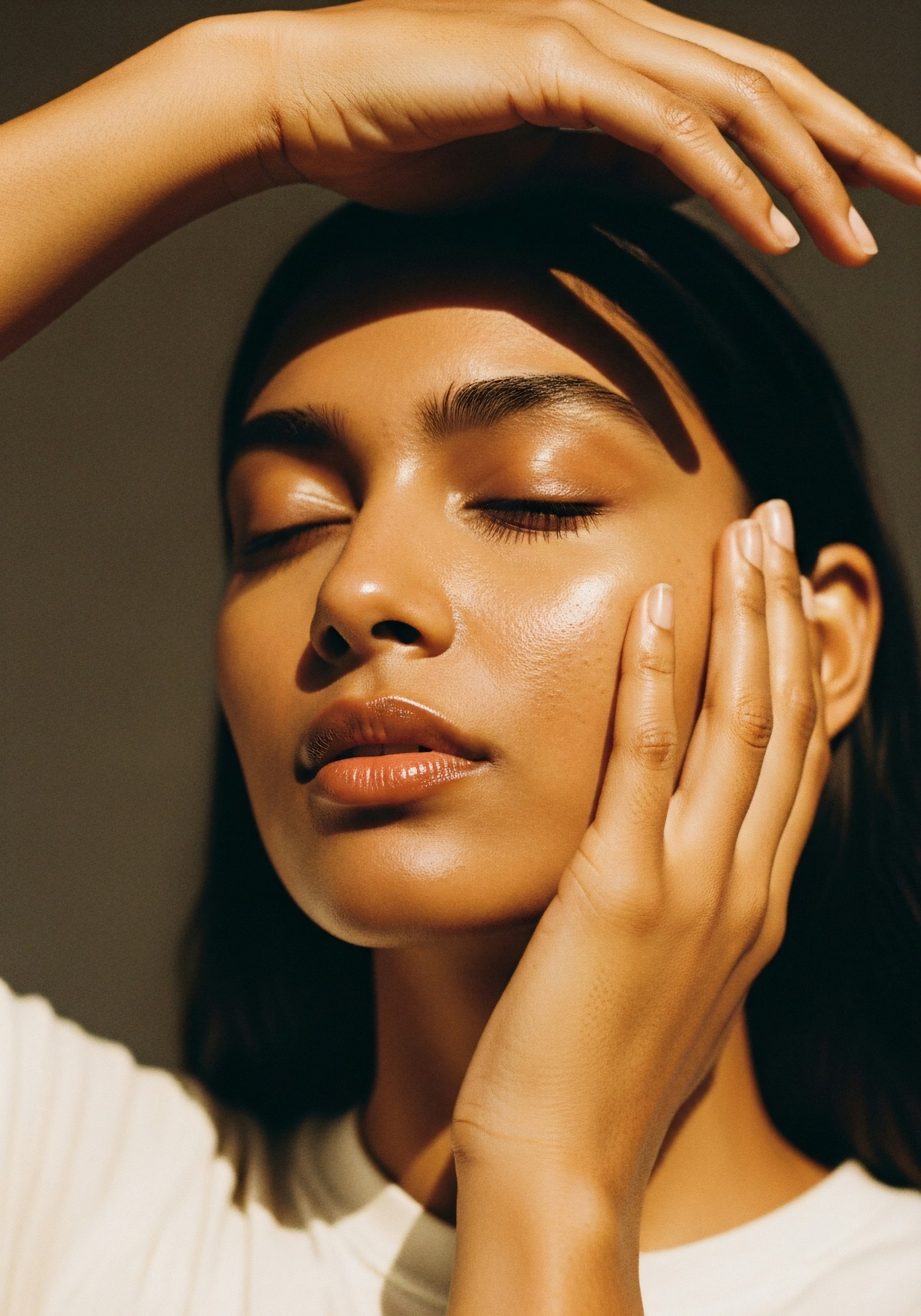 A serene close-up portrait of a person with glowing skin, closed eyes, and a gentle pose, emphasizing natural beauty and soft lighting.