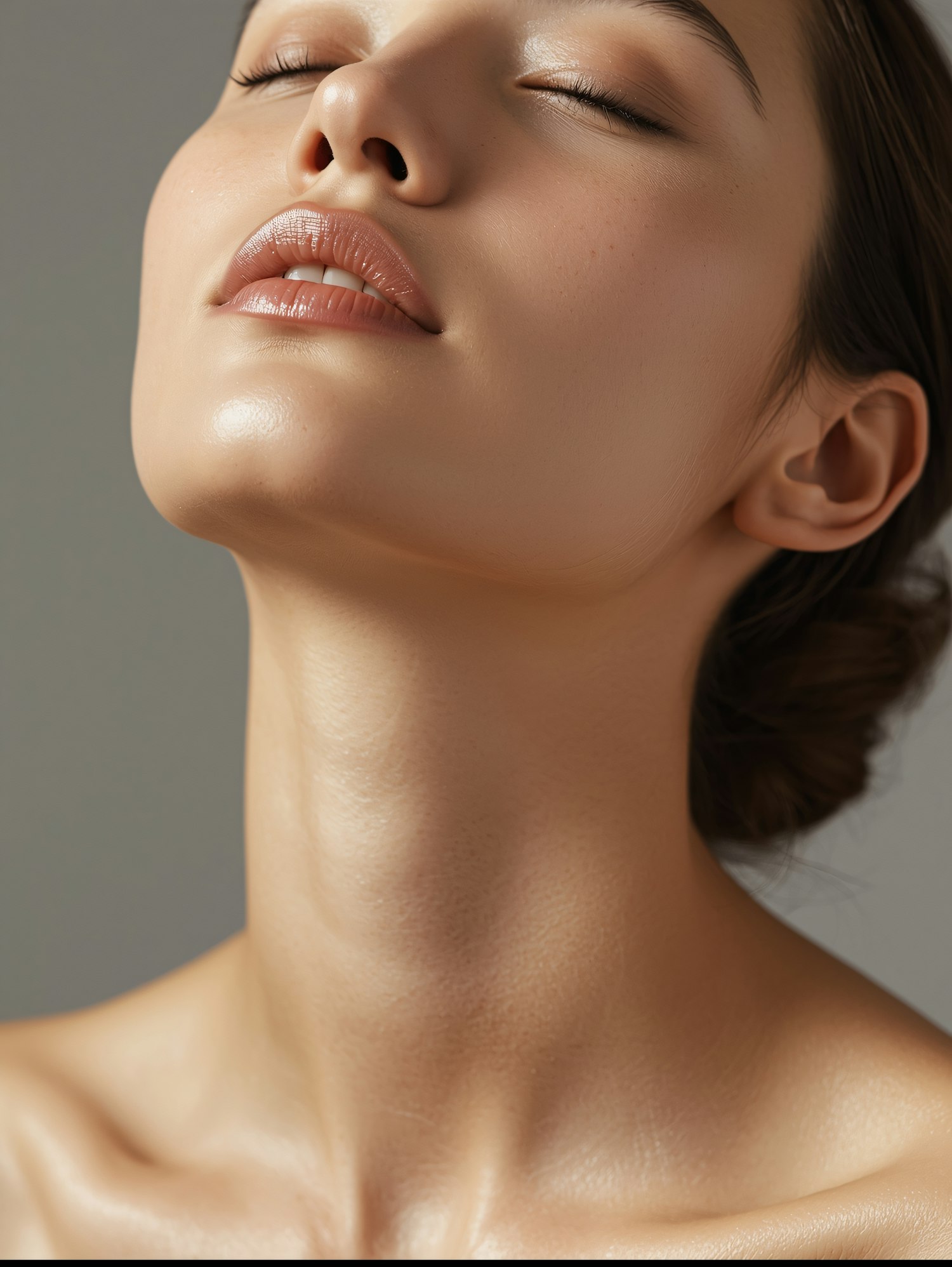 Close-up of a serene face with glowing skin, closed eyes, and relaxed expression, emphasizing natural beauty and smooth contours.