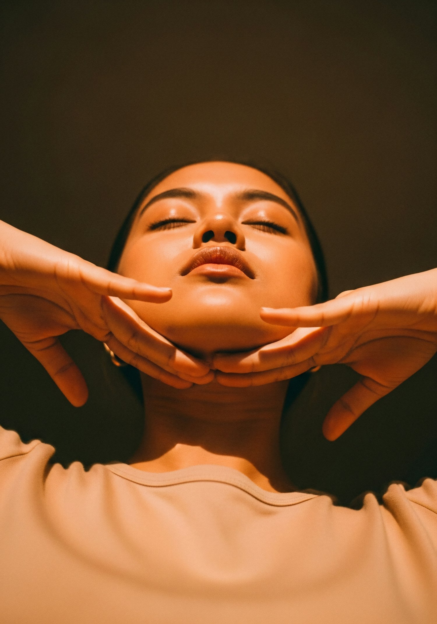 A serene close-up of a person with warm lighting, eyes closed, and hands framing their face, creating a tranquil and introspective mood.