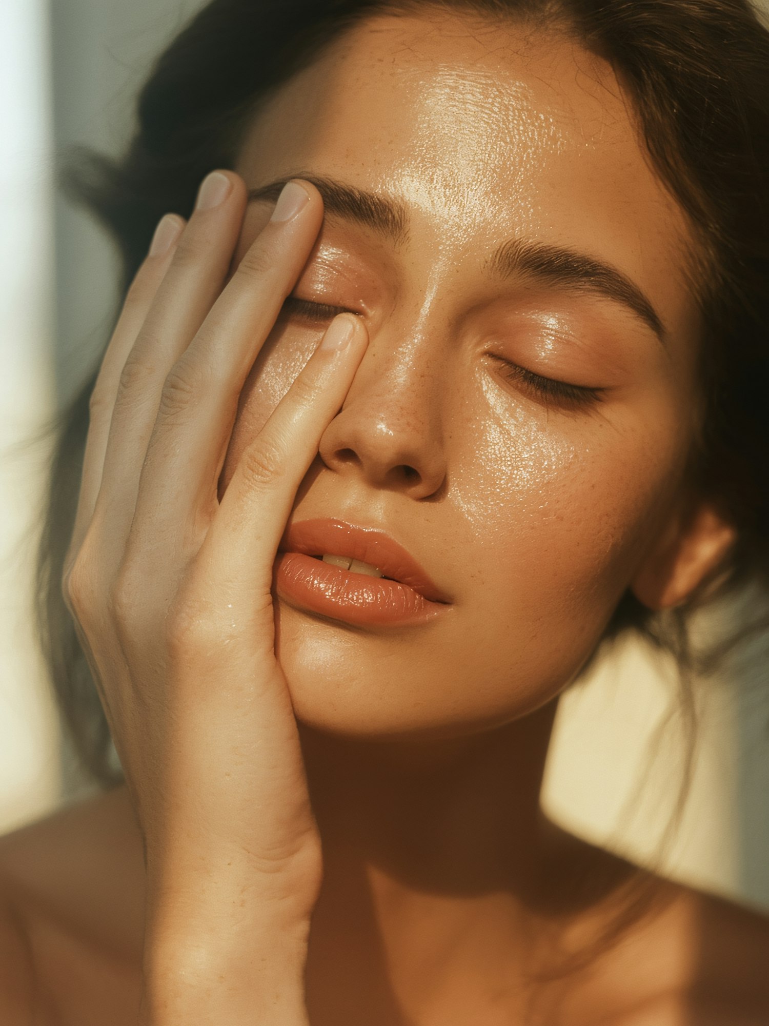 Close-up of a serene individual with glowing skin, closed eyes, and a gentle hand on their face, bathed in warm, soft light.