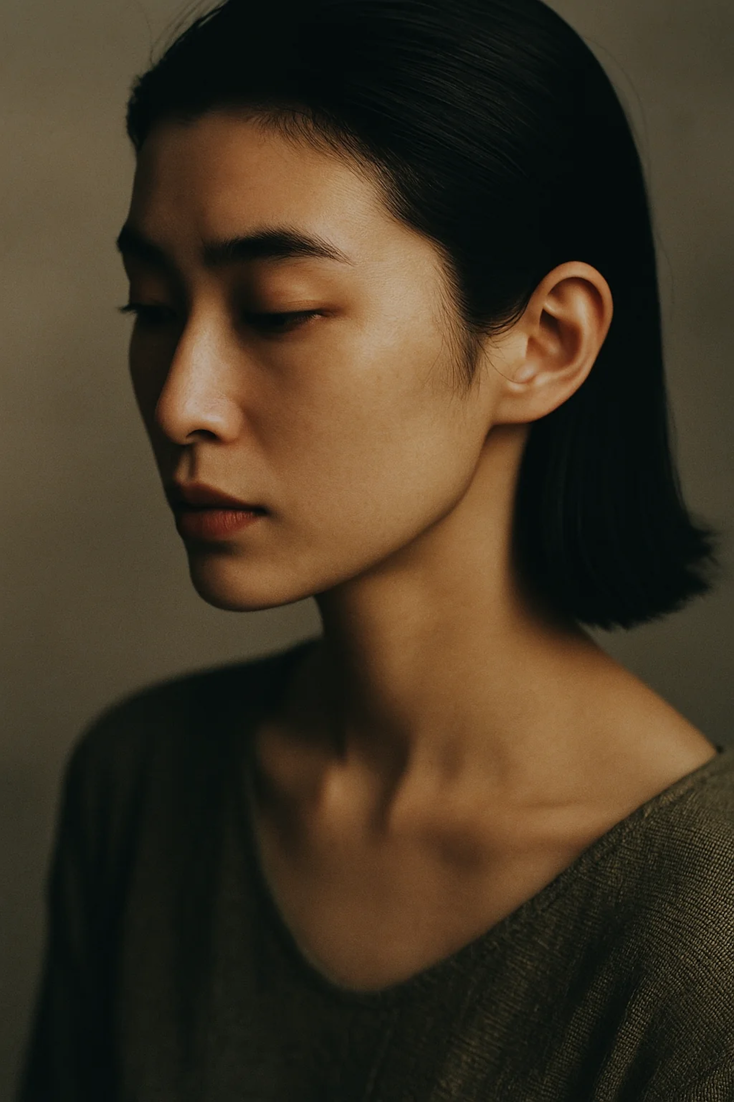 Minimalist portrait of an Asian woman with sleek dark hair, wearing an olive-green top, set against a soft neutral background.