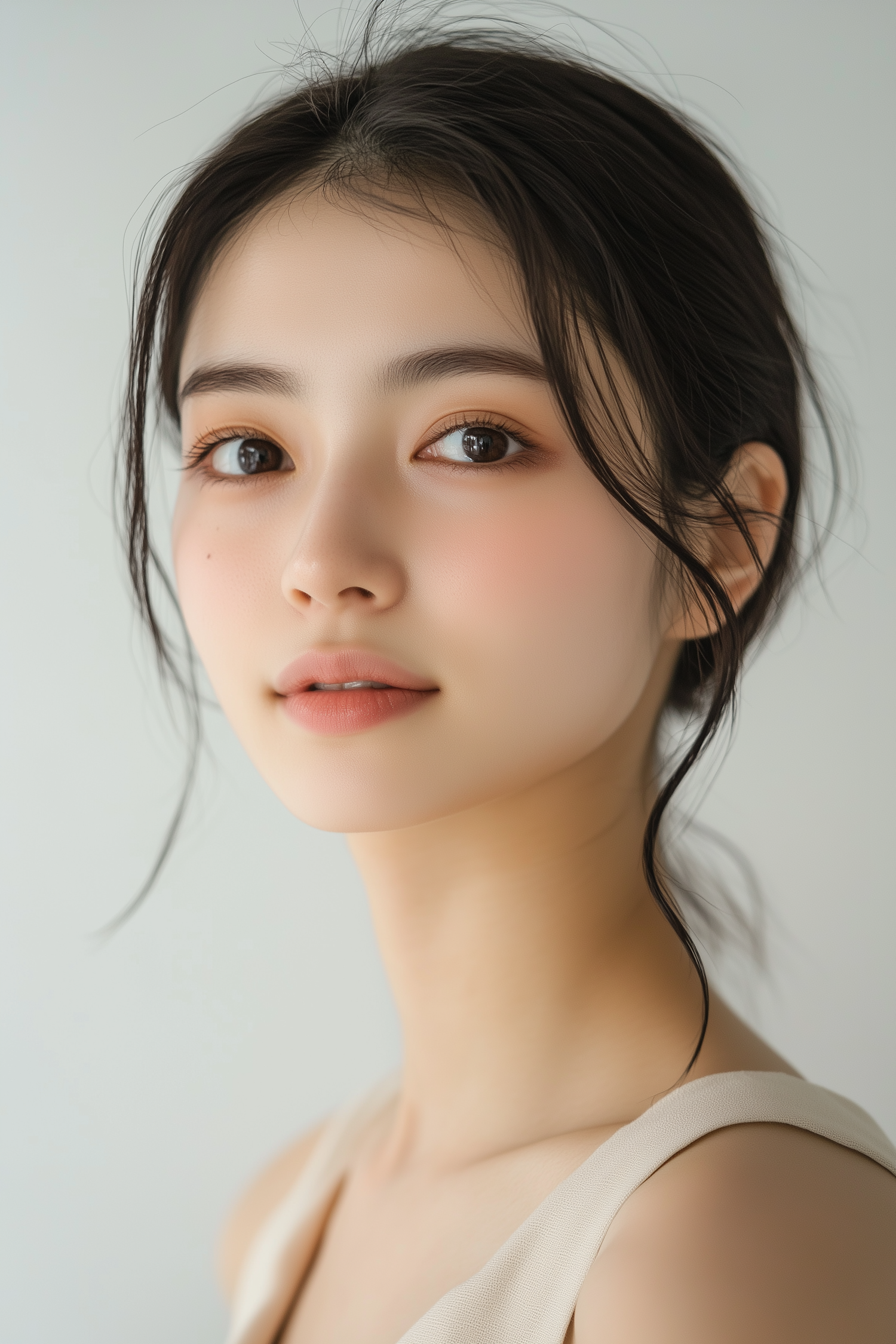 Close-up portrait of a young woman with fair skin, expressive eyes, and a soft updo hairstyle, exuding natural elegance.