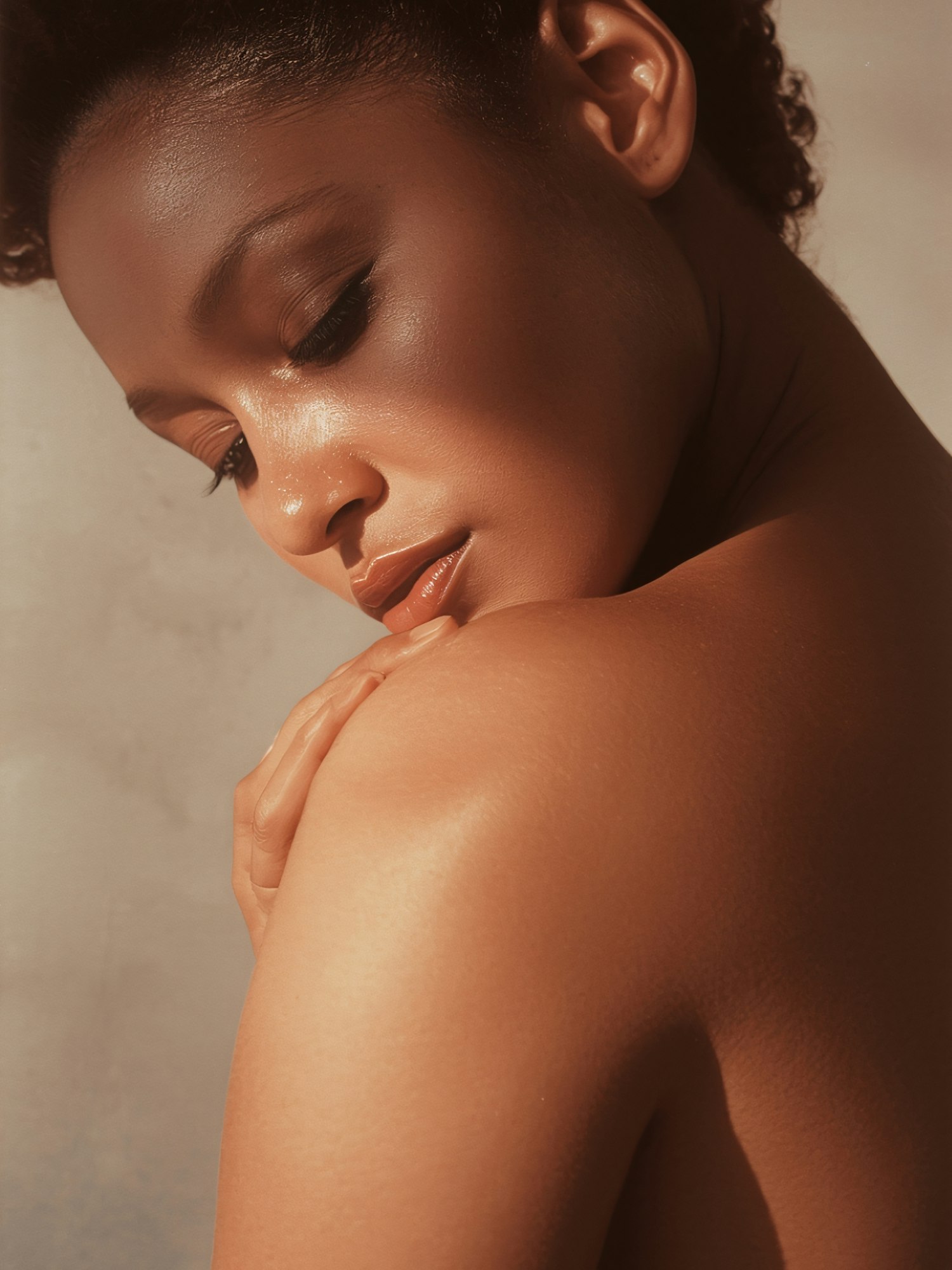 A serene close-up portrait of a woman with glowing skin, natural hair, and a calm expression, bathed in warm, soft lighting.