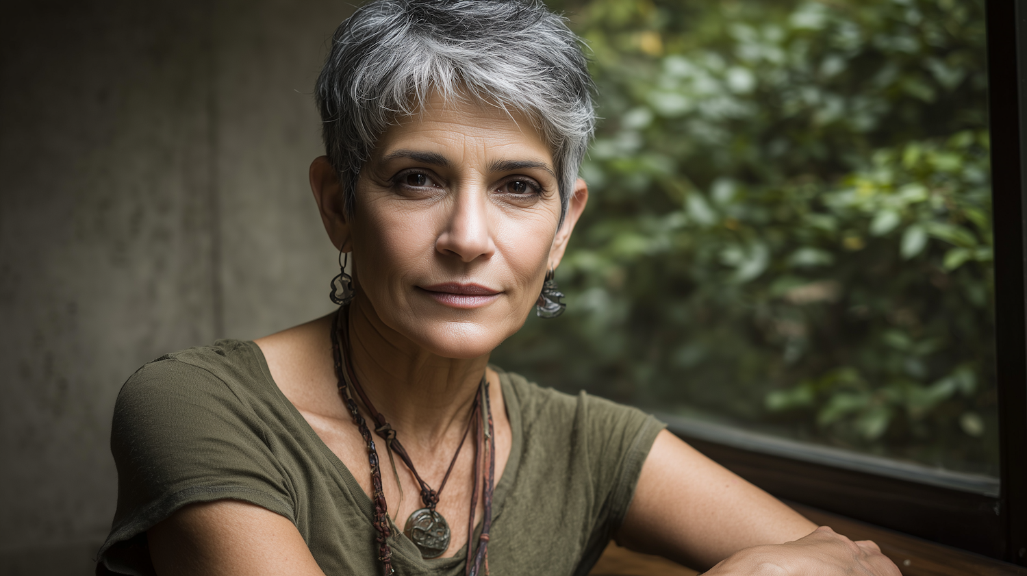 A serene portrait of a woman with silver-gray hair, wearing a green top and necklaces, sitting by a window with greenery in the background.