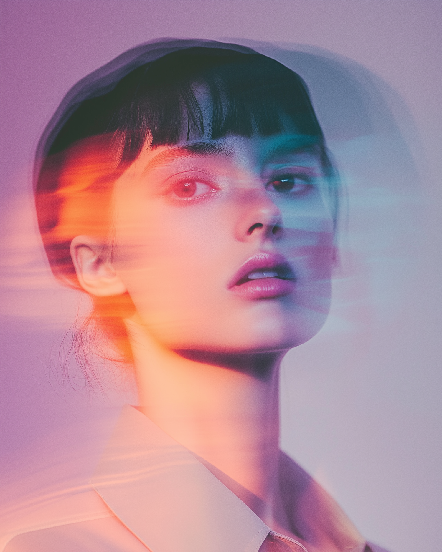 Ethereal portrait of a young woman with vibrant color blur effects, creating a dreamy and modern visual impact.