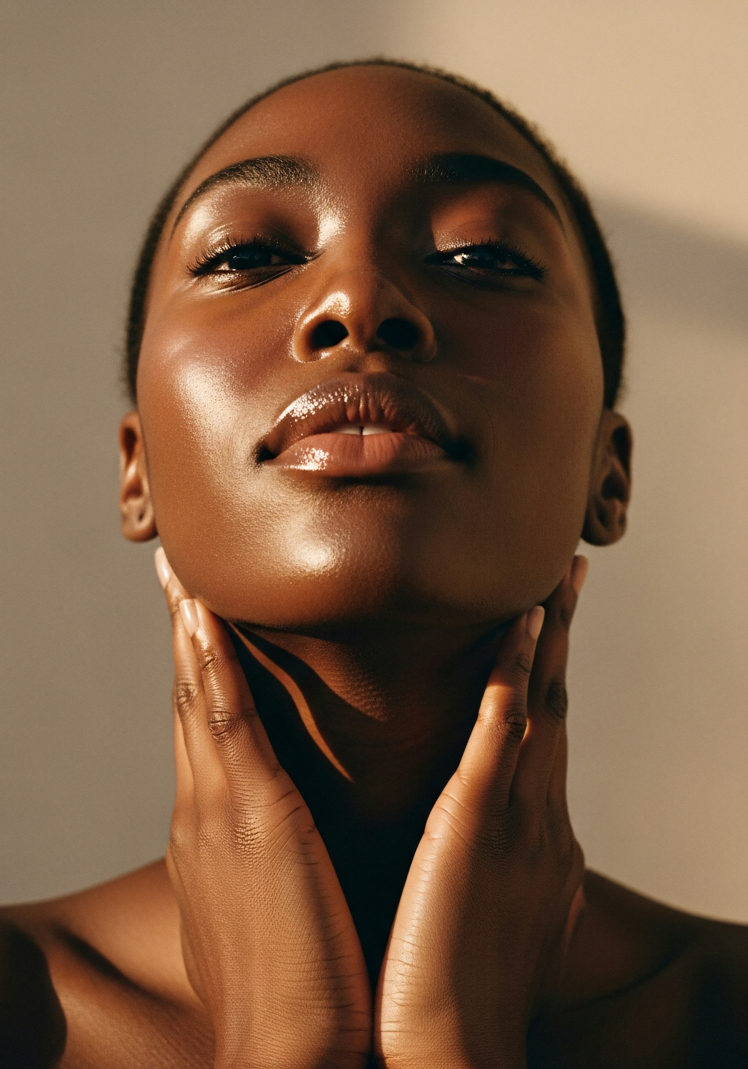 Close-up portrait of a person with glowing skin and serene expression, hands gently touching their neck, in warm, soft lighting.