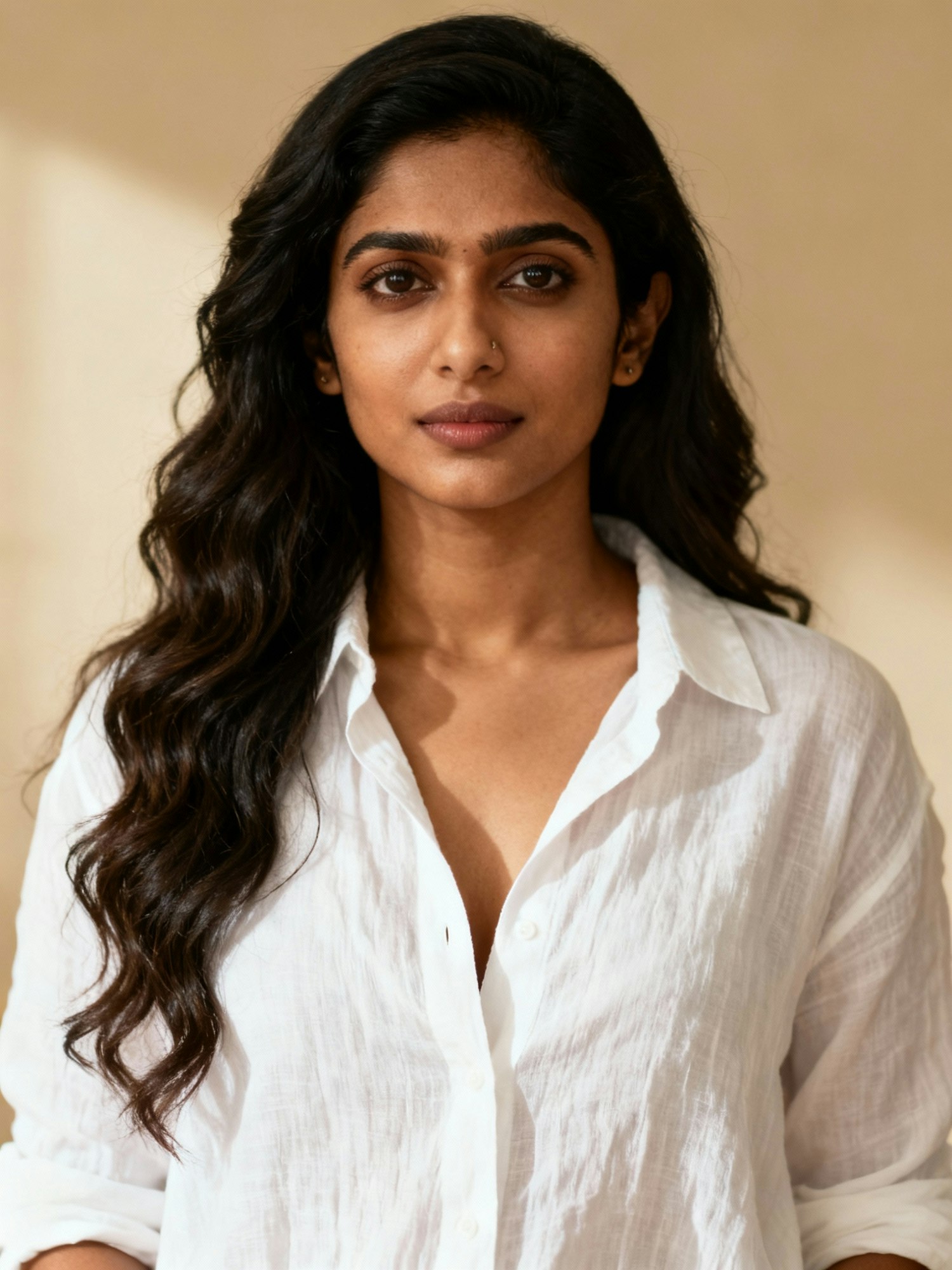 Cinematic portrait of a indian woman, 26; long wavy hair; white linen shirt. Background: plain beige, defocused.