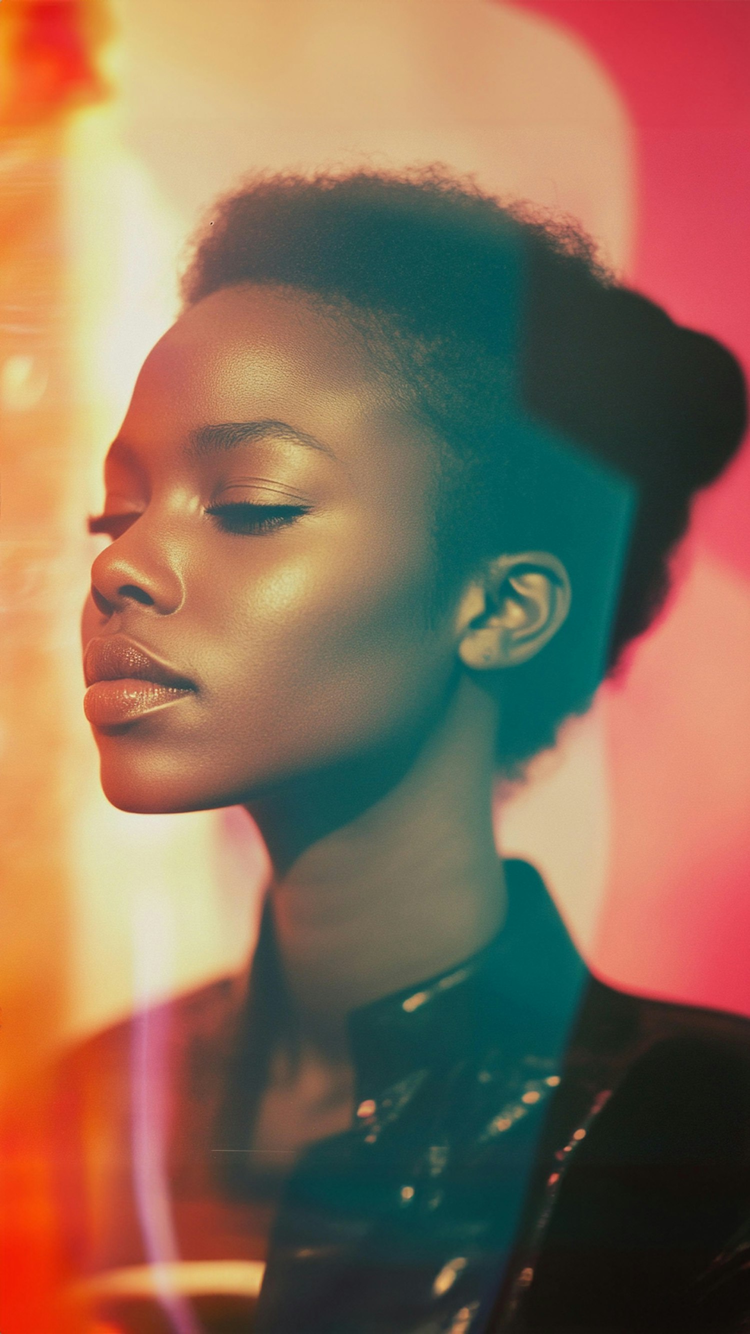 A serene close-up of a Black woman with glowing skin, closed eyes, and artistic lighting in warm pink, orange, and teal tones.