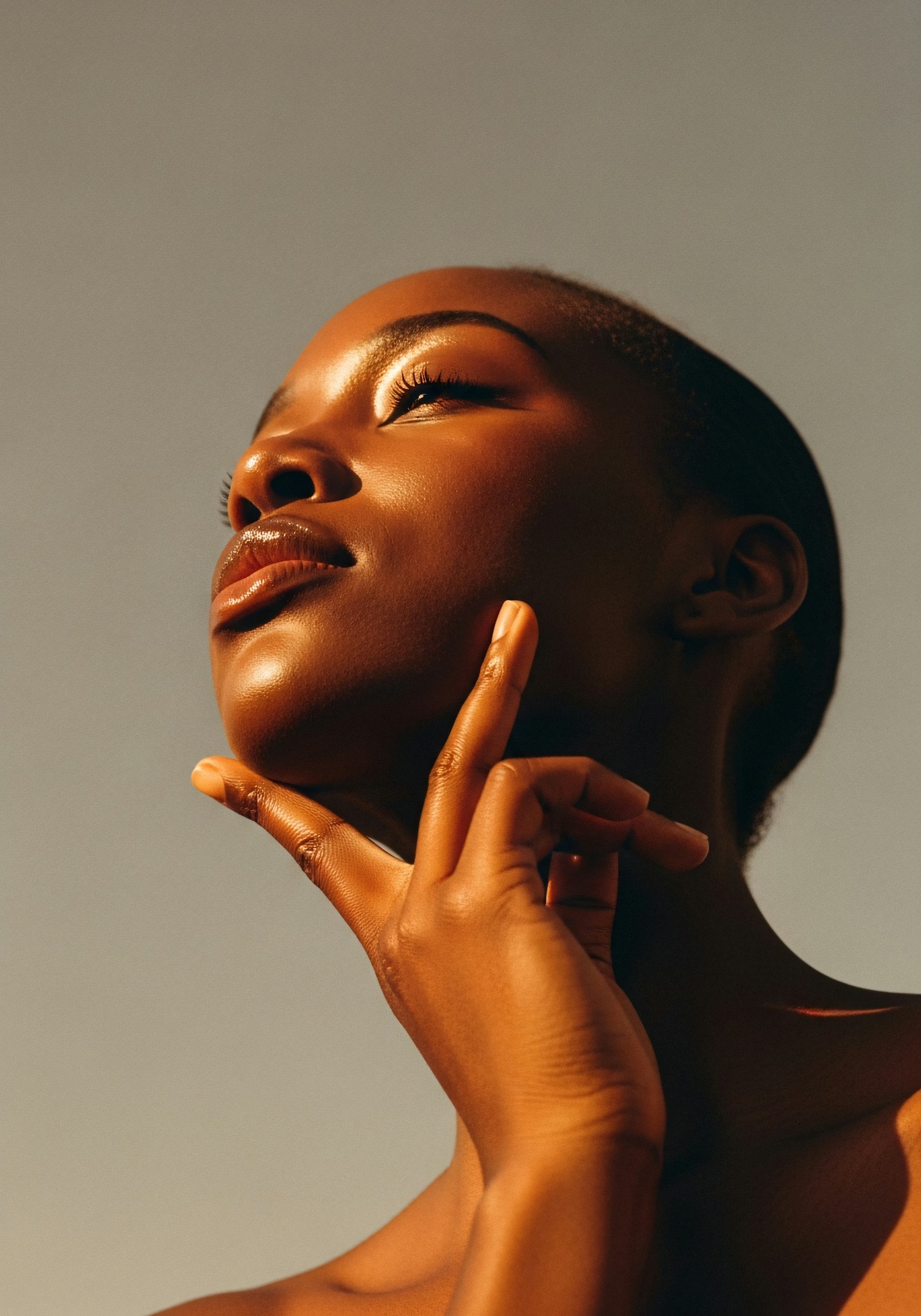 A close-up portrait of a person with warm lighting highlighting their serene expression and smooth skin, set against a soft gradient background.