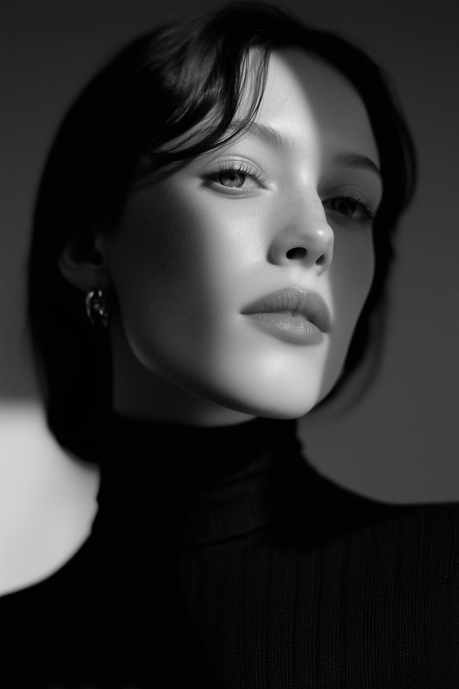 Monochromatic portrait of a person with soft lighting emphasizing their serene expression and facial features.