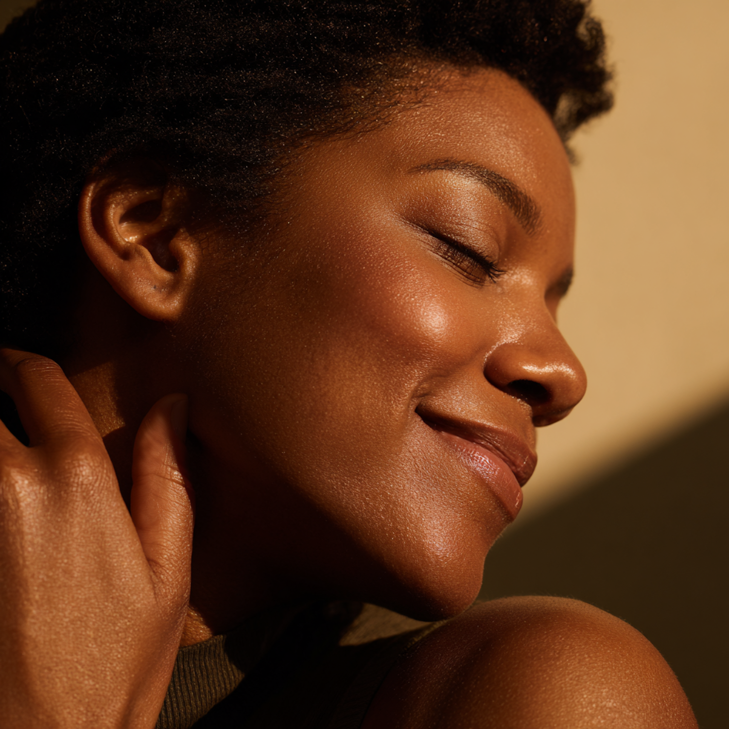 Close-up of a woman with glowing skin, smiling softly in warm light, showcasing natural beauty and tranquility.