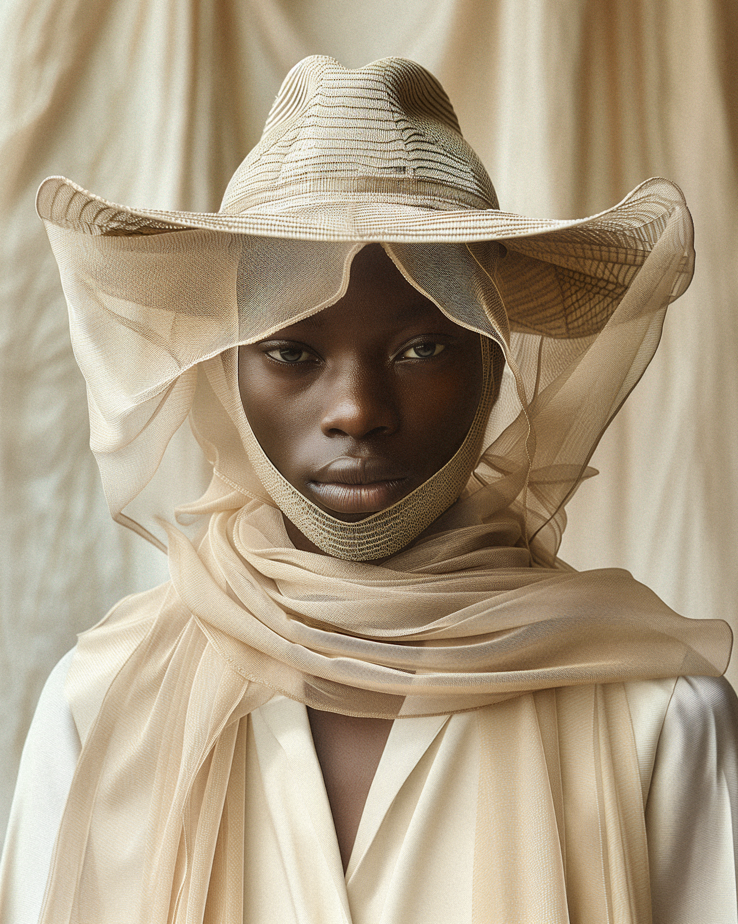 Elegant portrait of a woman in a wide-brimmed hat with a sheer veil, set against a neutral background.