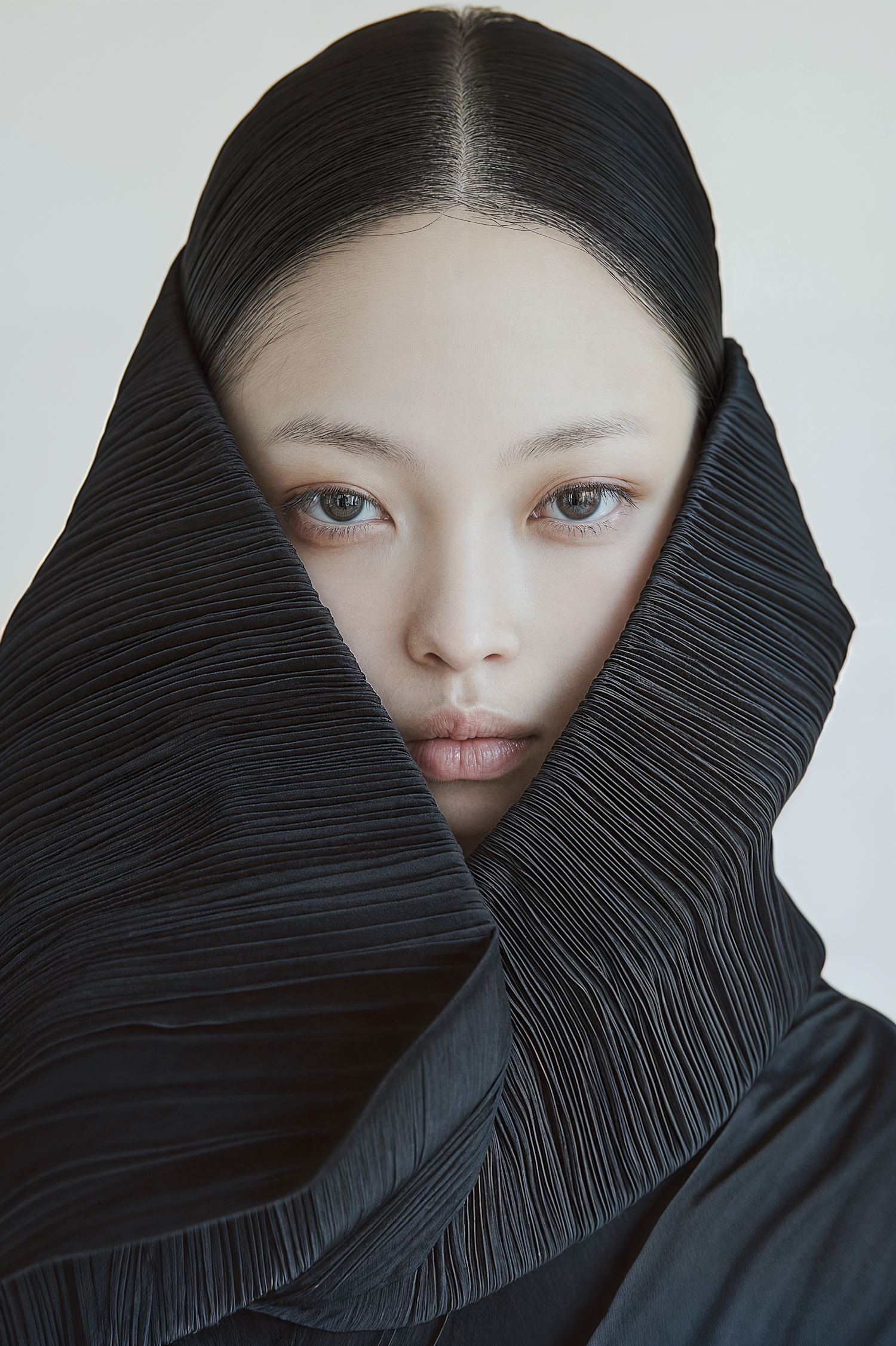 Asian woman with sleek black hair and light blue eyes wrapped in pleated black fabric, creating a striking and serene portrait.