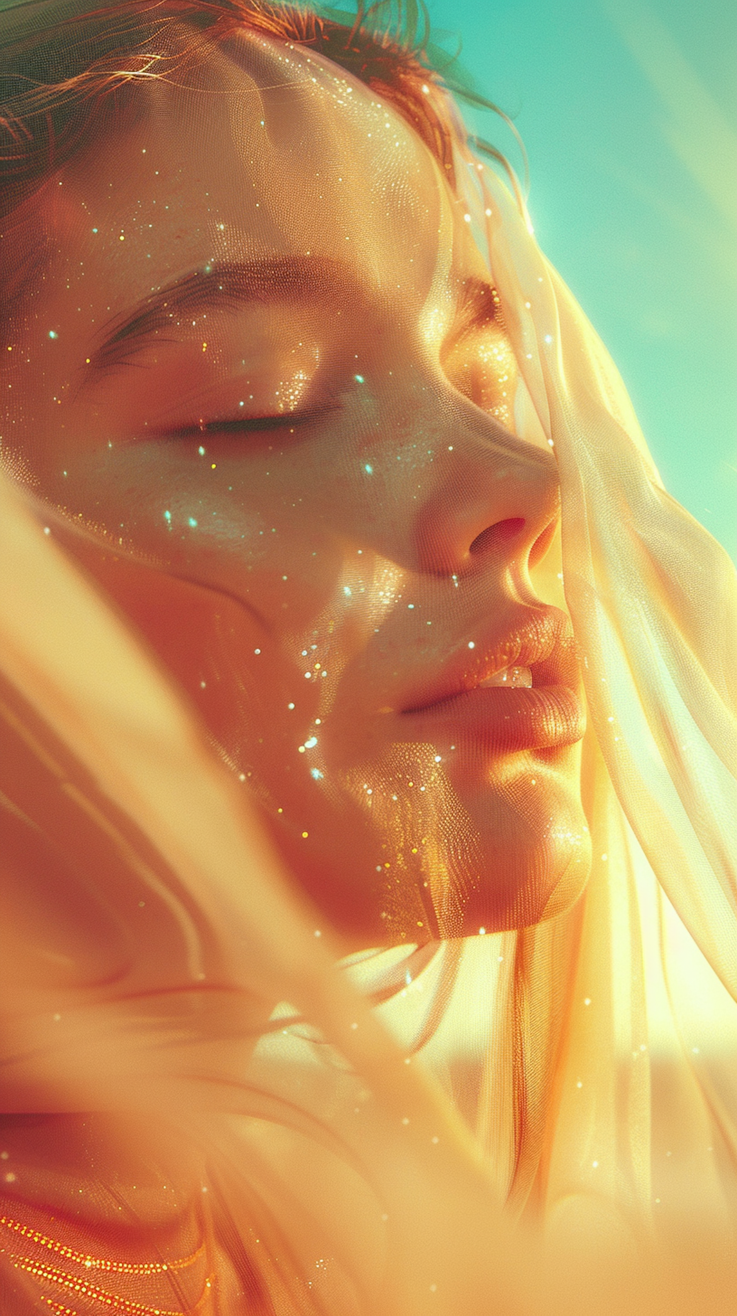 Serene close-up of a woman with golden fabric and sparkling particles, creating a dreamy, ethereal effect in warm sunlight.