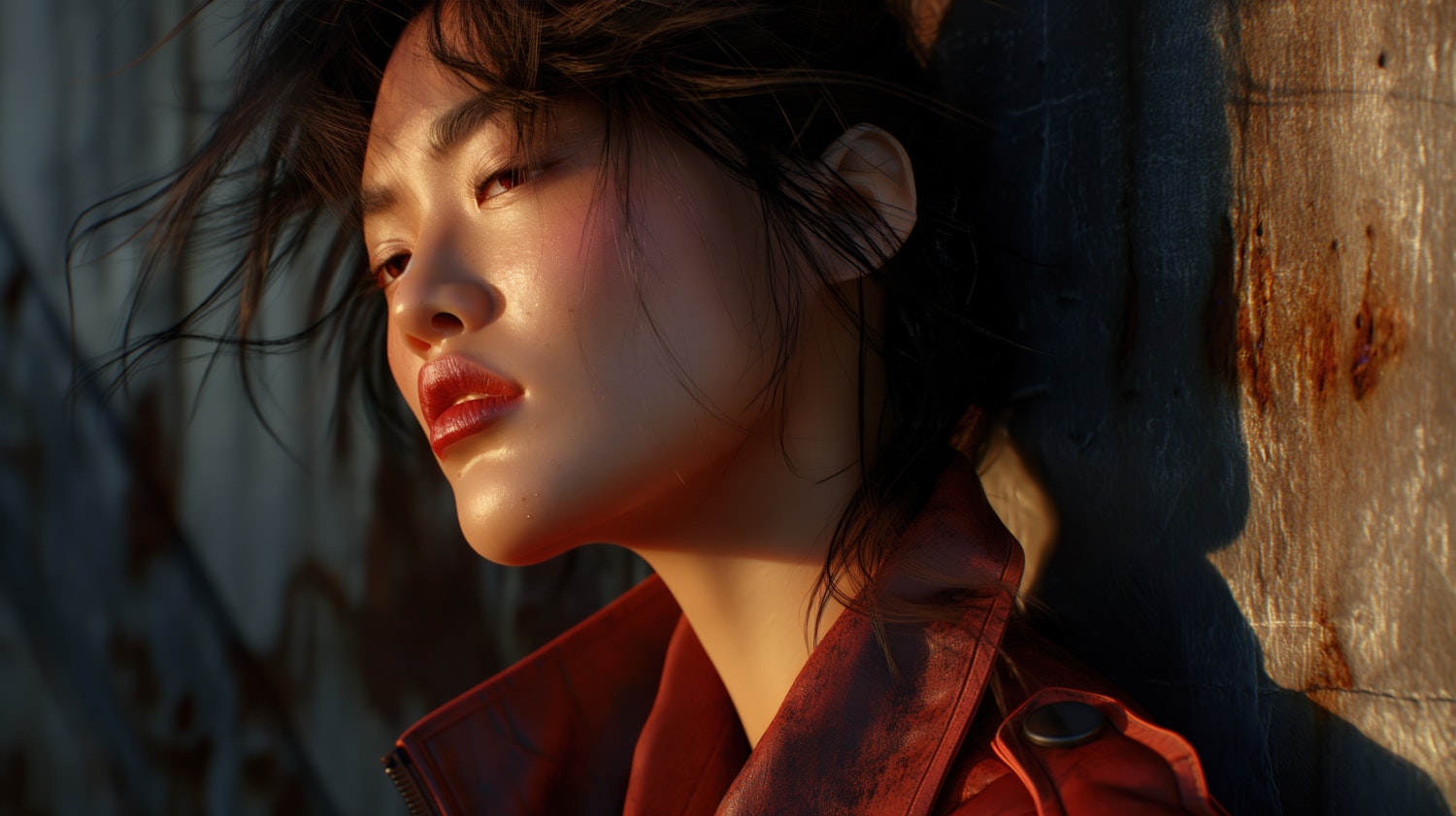 Asian woman in red leather jacket, leaning against a textured wall, bathed in warm sunlight. Serene expression, glossy red lips.