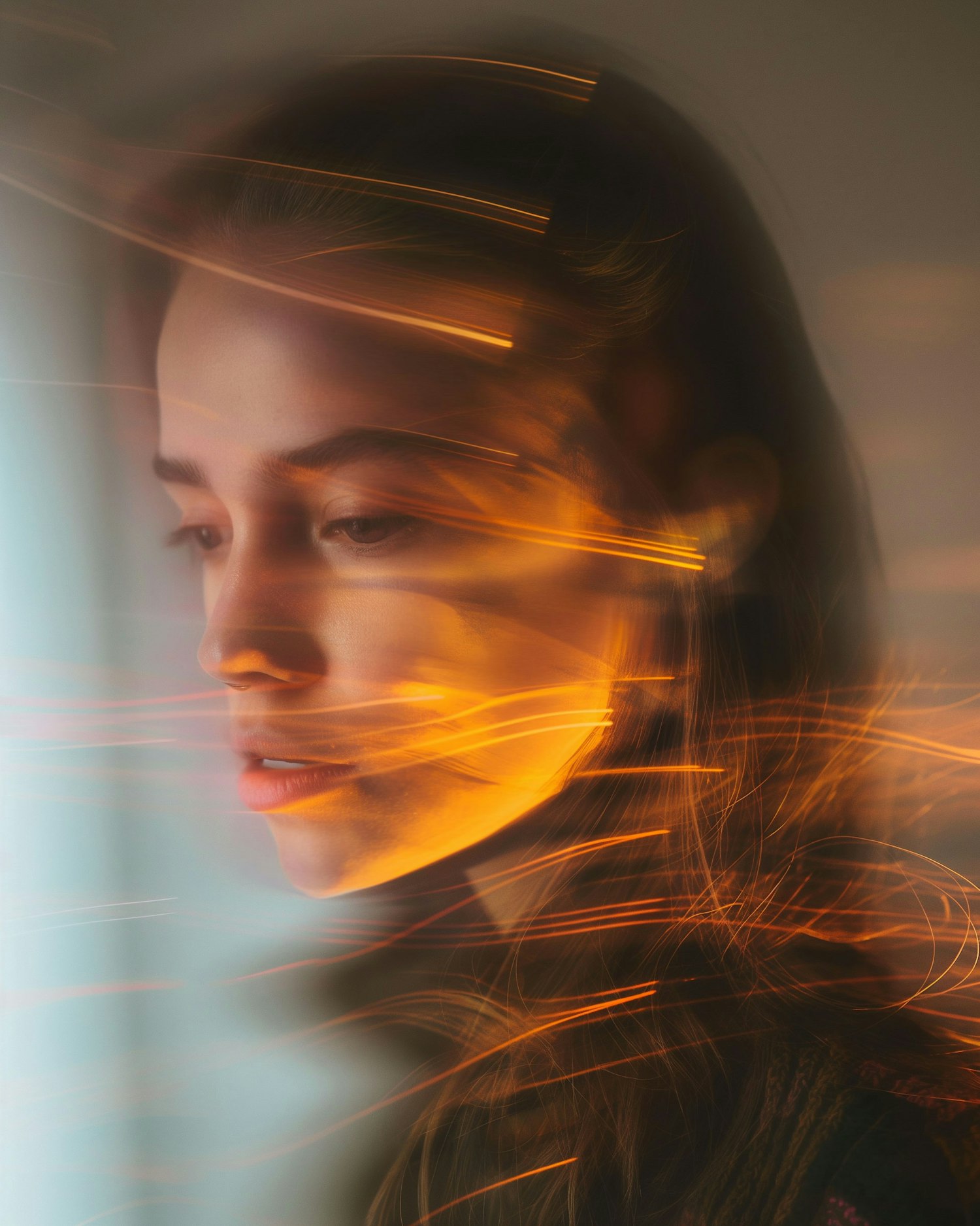 Ethereal portrait of a young woman with golden light trails, creating a dreamy and introspective atmosphere.