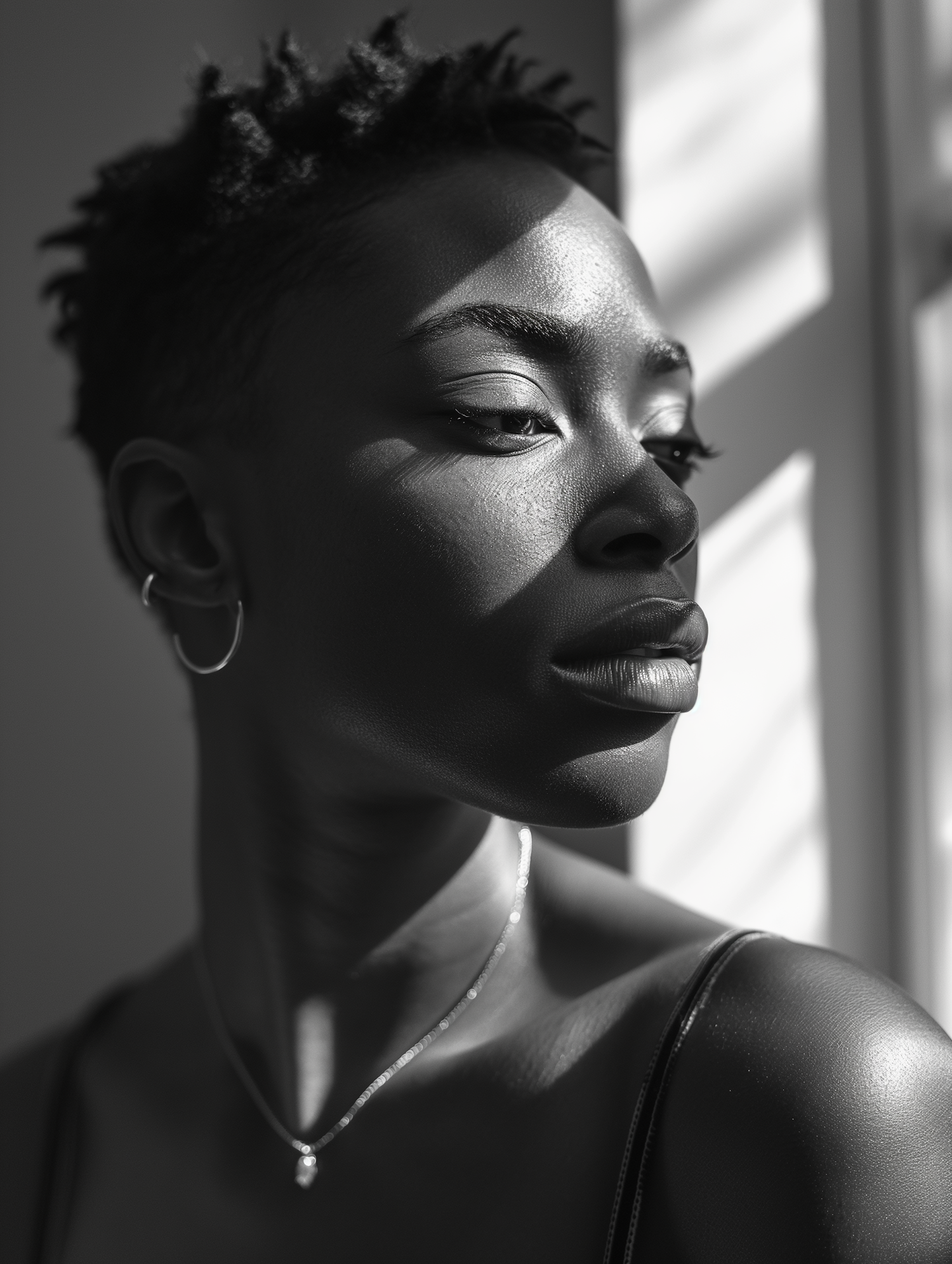 Black and white portrait of a person with short hair, wearing a necklace and hoop earring, in dramatic lighting.