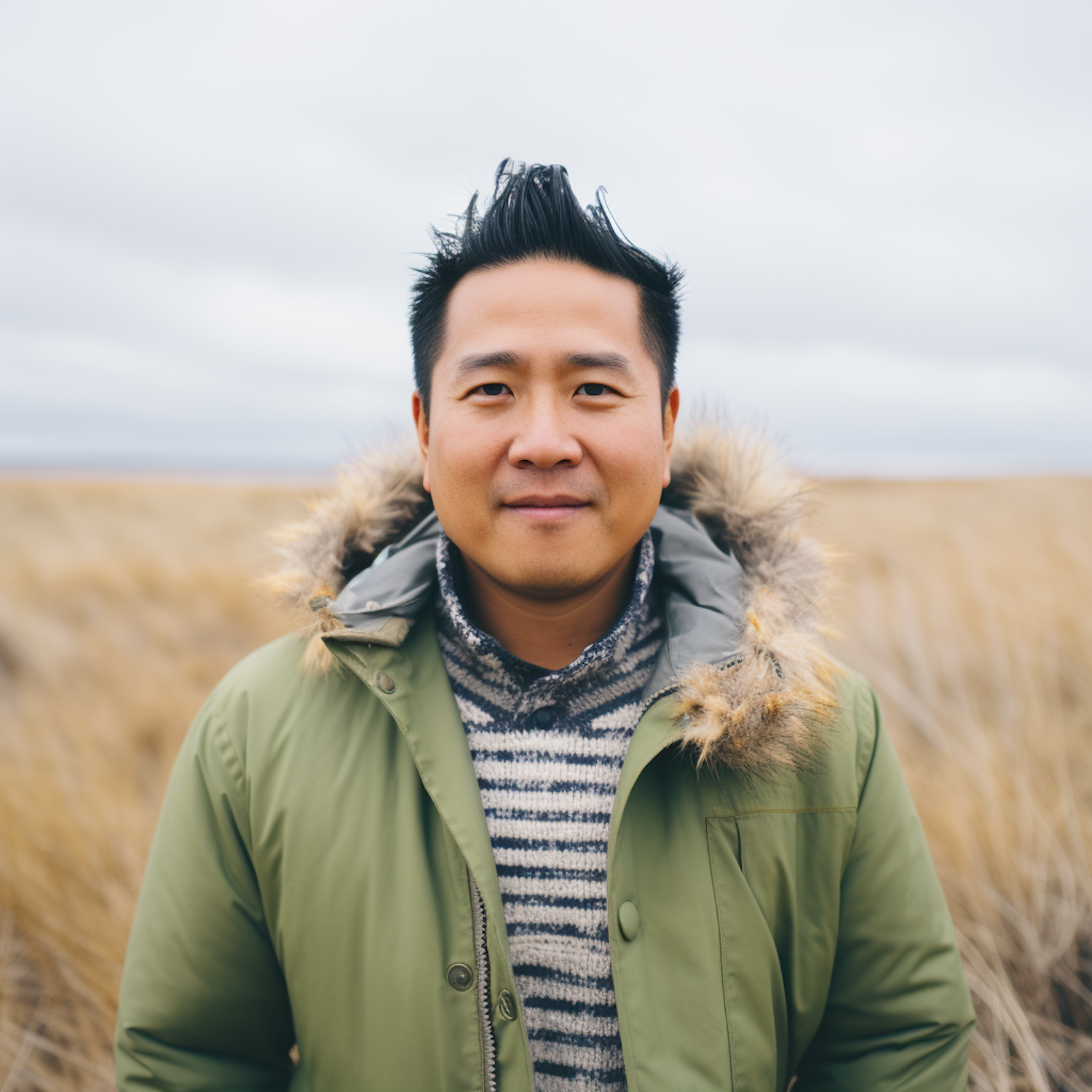 Asian man in a green parka with fur hood stands in a grassy field under an overcast sky, exuding calm and warmth.