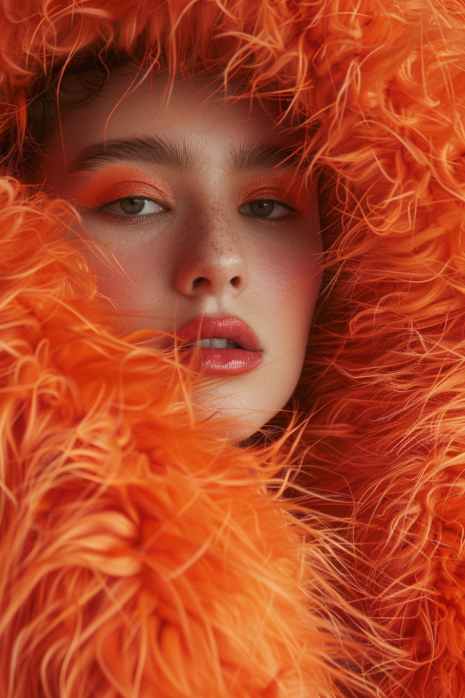 Close-up of a woman with orange makeup and fur, creating a vibrant and striking visual effect.