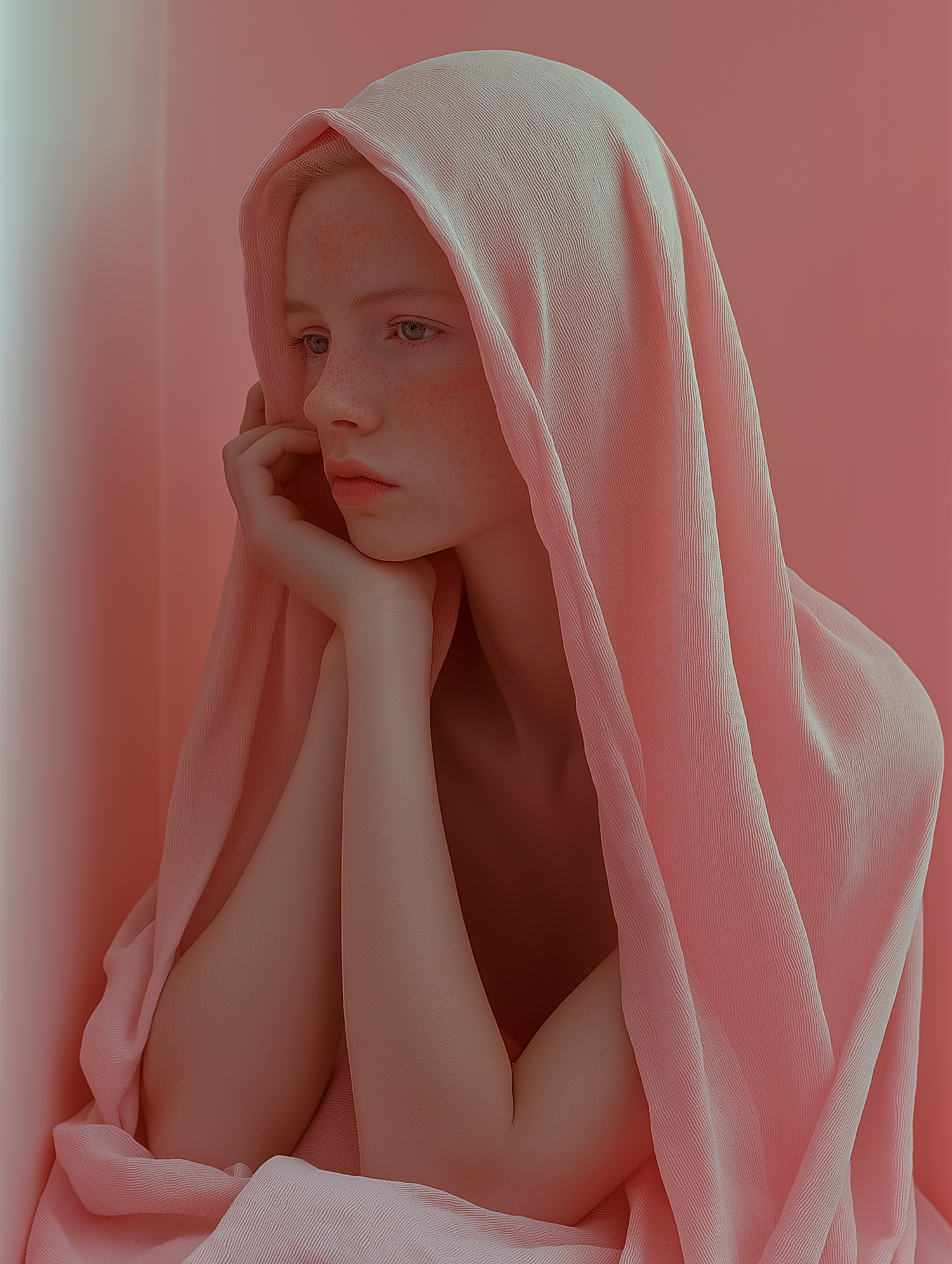 A serene portrait of a young woman draped in pink fabric, gazing thoughtfully with a calm expression against a soft pink background.