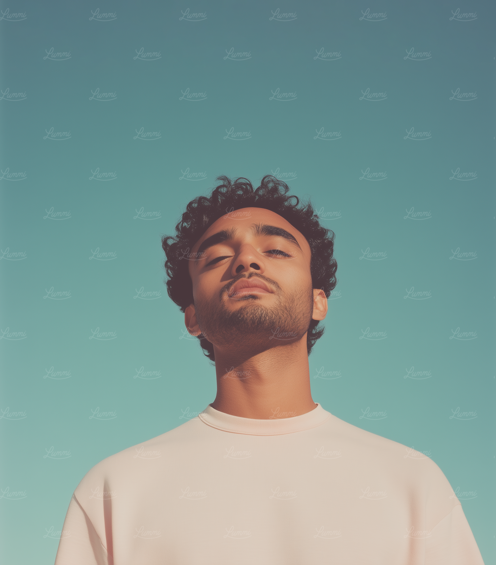 A serene portrait of a young man with curly hair and a beard, eyes closed, against a vibrant turquoise sky, wearing a light beige sweatshirt.