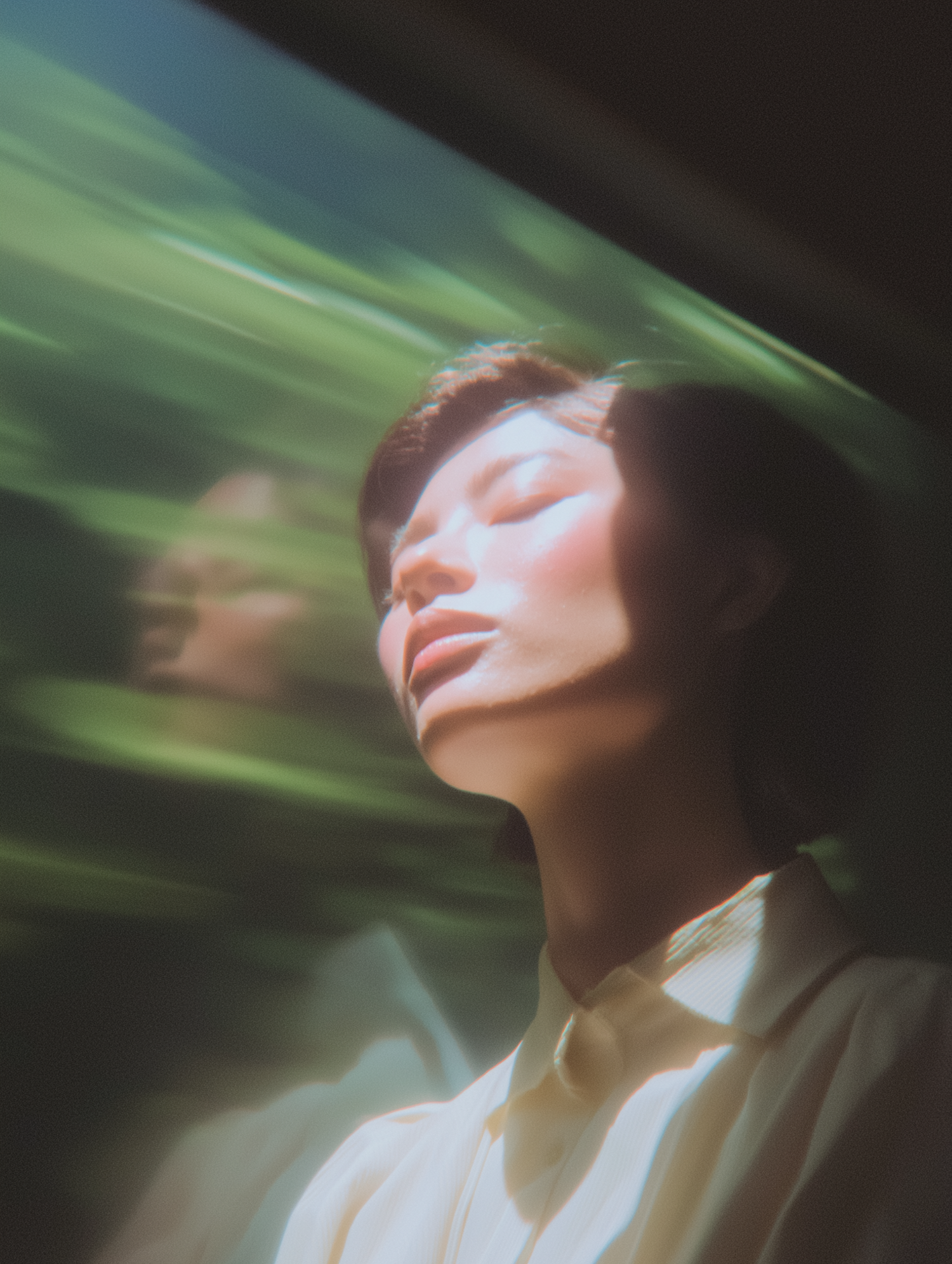 A serene portrait of a person in soft sunlight with a blurred green background, evoking a dreamy and tranquil atmosphere.