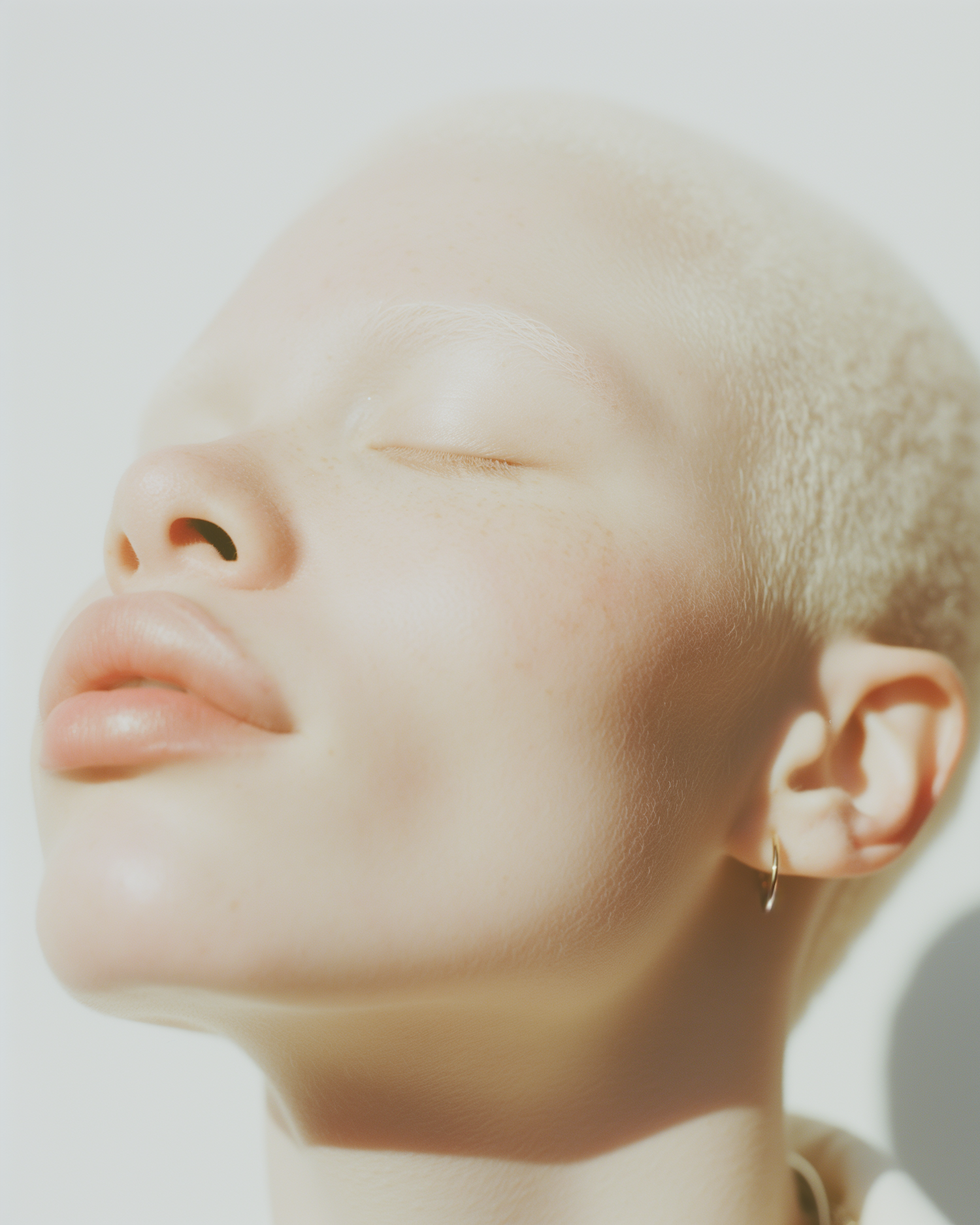 Close-up portrait of a person with light skin and short blonde hair, eyes closed, in soft natural light, wearing a hoop earring.