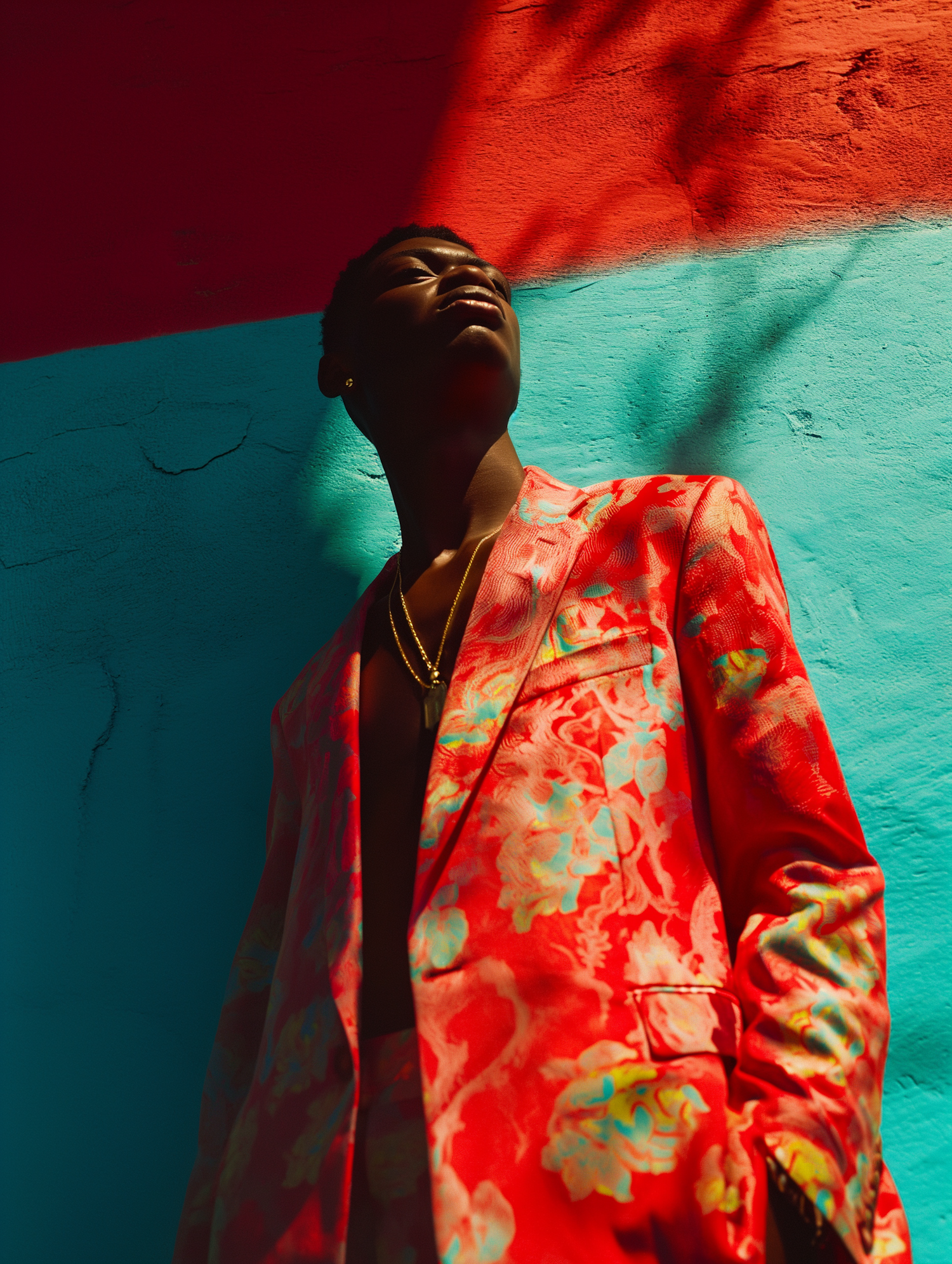 Stylish man in a red floral blazer against a vibrant red and turquoise wall, with dramatic lighting and palm leaf shadows.