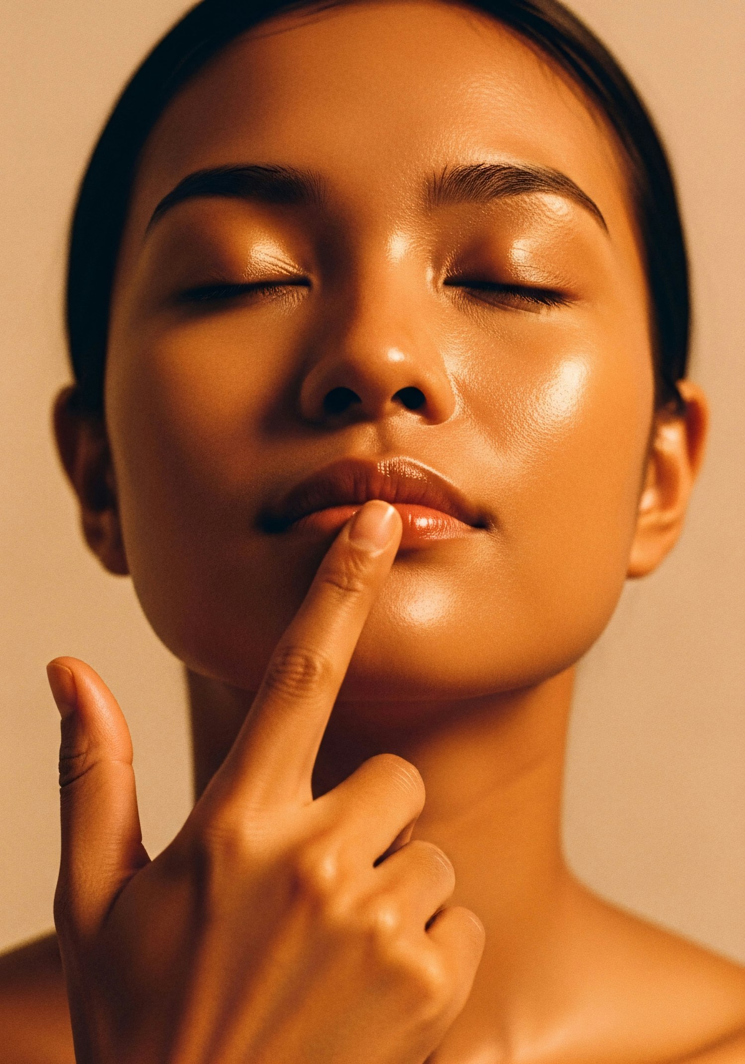 Close-up of a serene individual with glowing skin, eyes closed, and a finger gently touching their lips, set against a warm background.