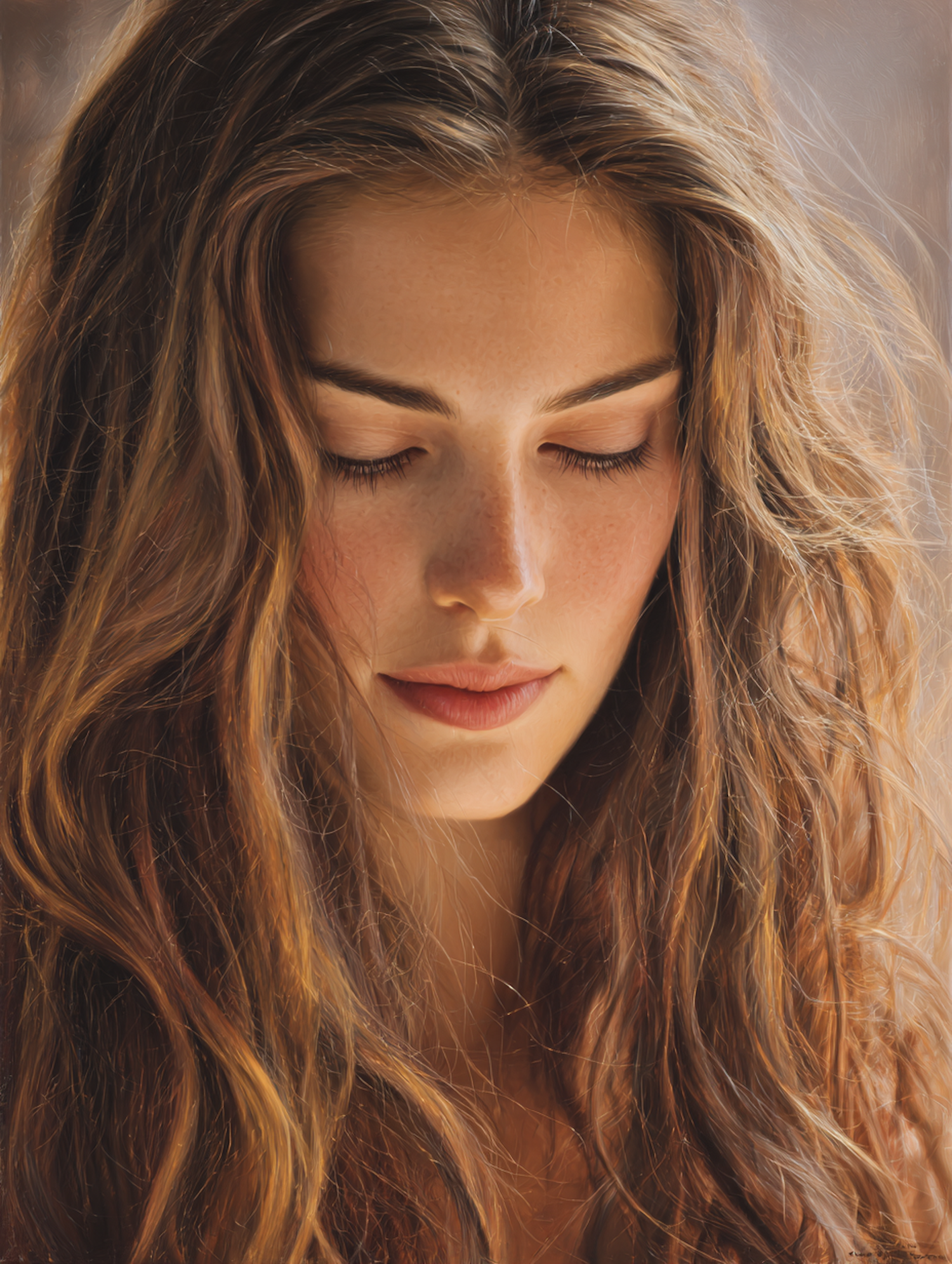 Close-up portrait of a serene young woman with wavy brown hair and closed eyes, bathed in soft, warm lighting.