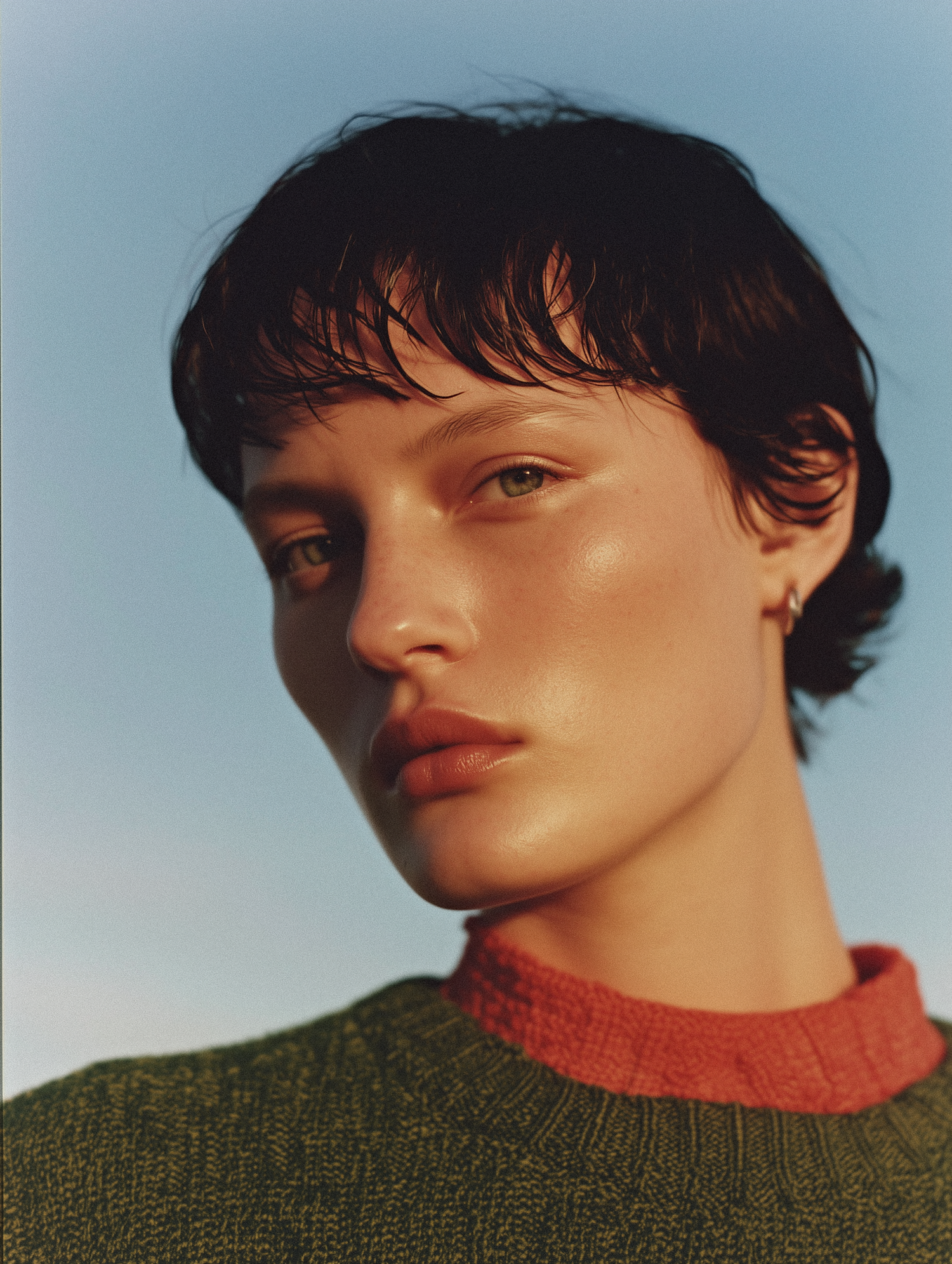 Close-up portrait of a person with short dark hair, wearing a green sweater with a red collar, set against a clear blue sky.